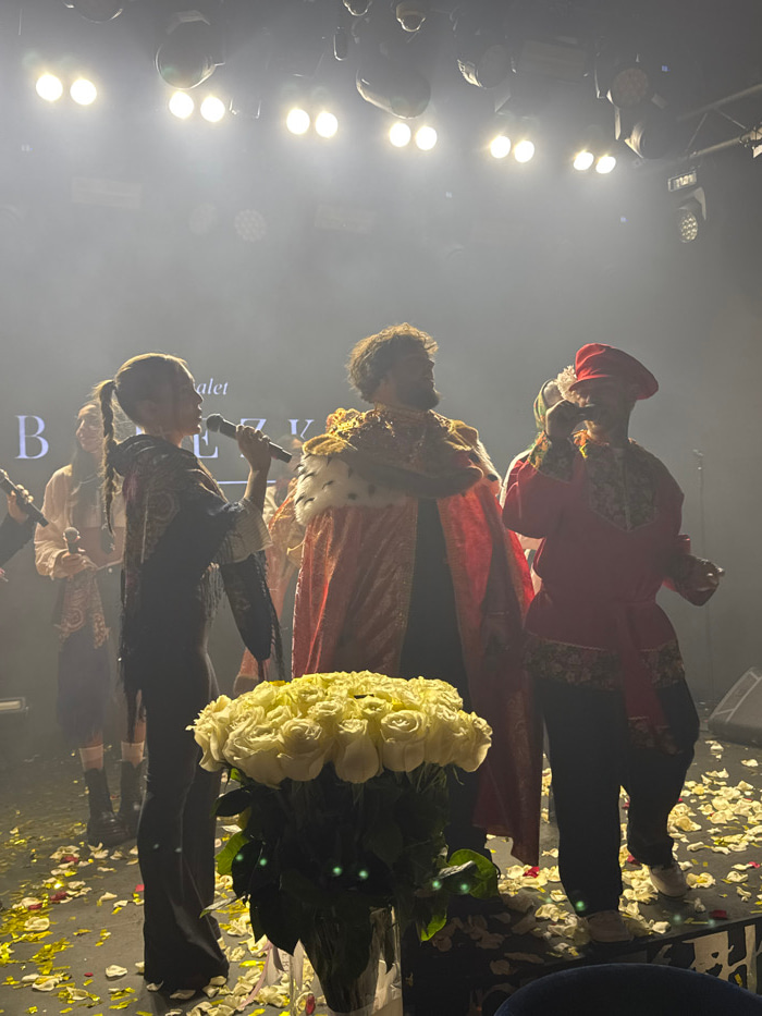 Three individuals stand on a stage covered in white and red flower petals, next to a bouquet of white roses. The person closest to the viewer has blonde hair in pigtails and holds a microphone. A tall…read more
