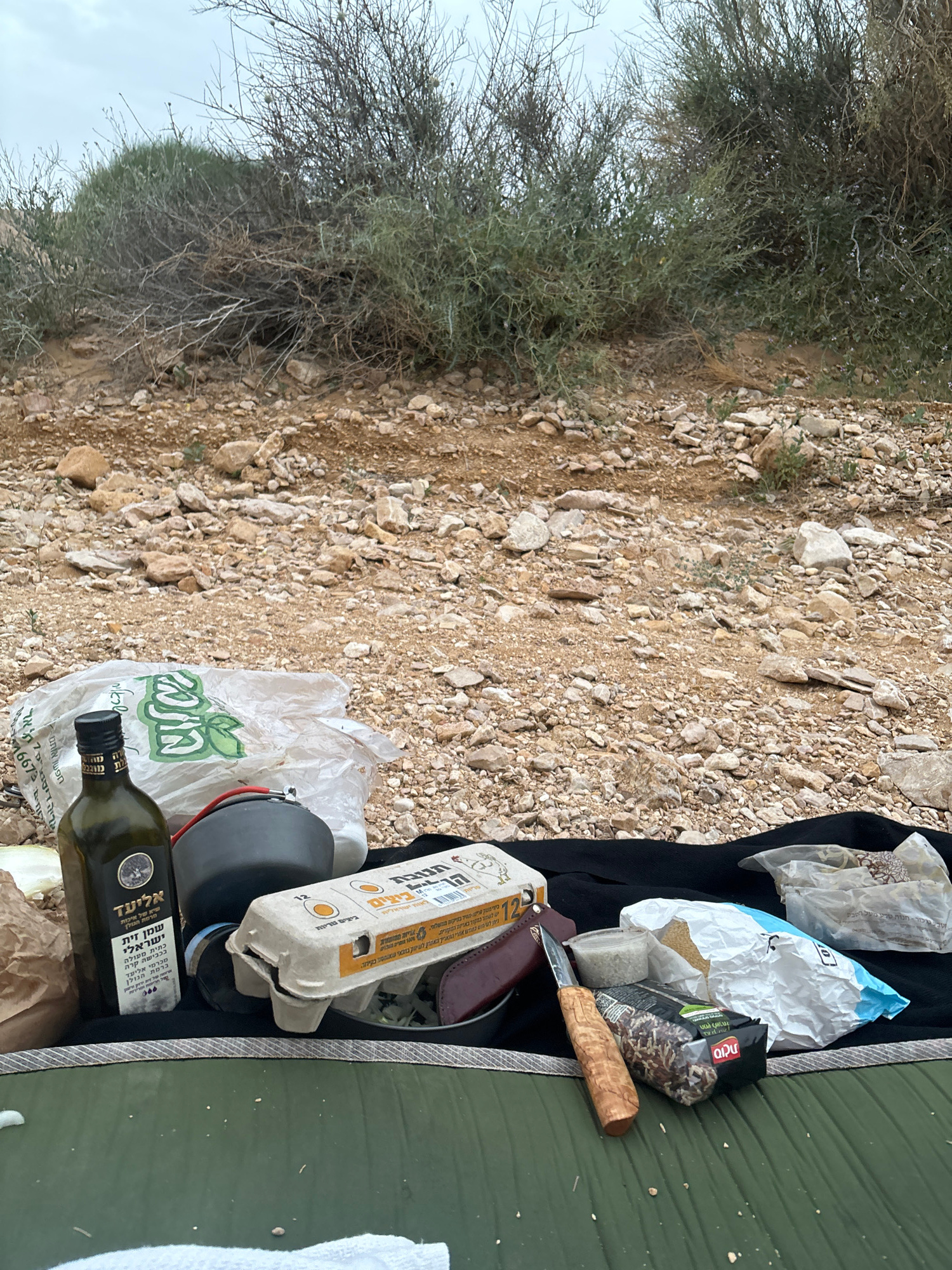 The image shows camping gear and food supplies arranged on a surface, seemingly outdoors. There is an olive oil bottle labeled "Eliad," a carton of eggs, and various packages of food. A knife is also…read more