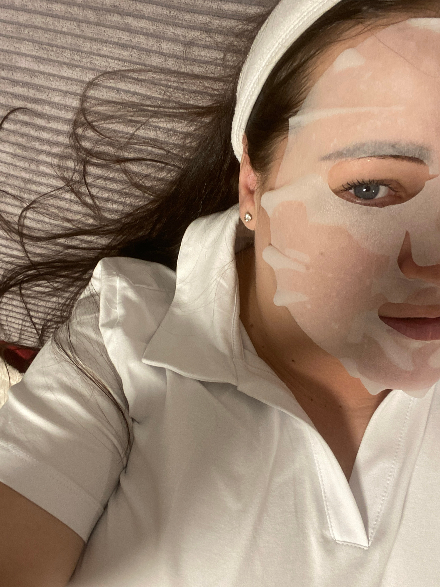A woman is lying on her back, wearing a white face mask and a white shirt. She has long, dark hair and is wearing a white headband. She is lying on a gray, striped surface. No elements in the image su…read more