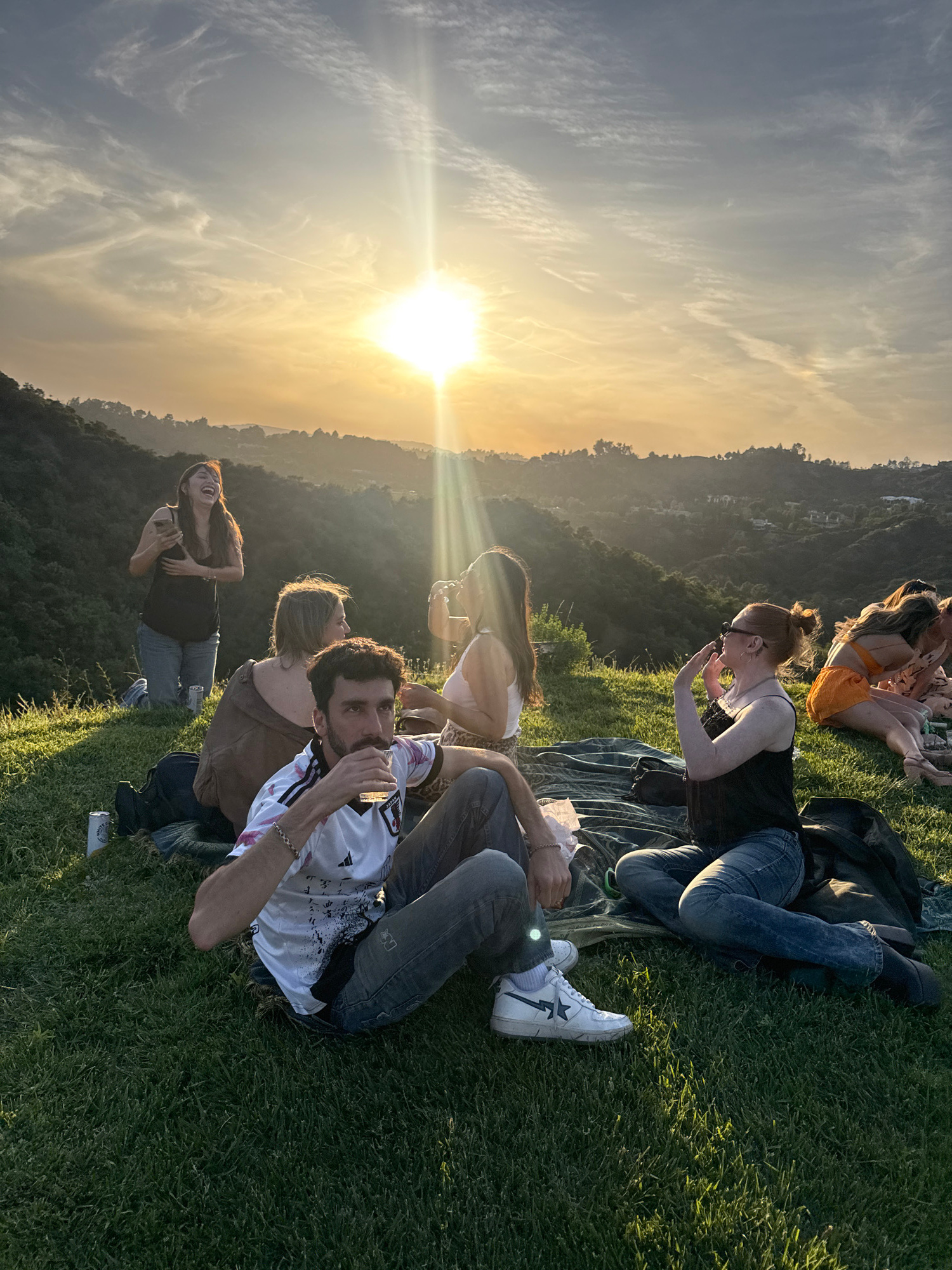 A group of people is sitting on a grassy hill overlooking a valley at sunset. The location is in Los Angeles, United States of America. The sun is setting in the background, creating a warm golden glo…read more