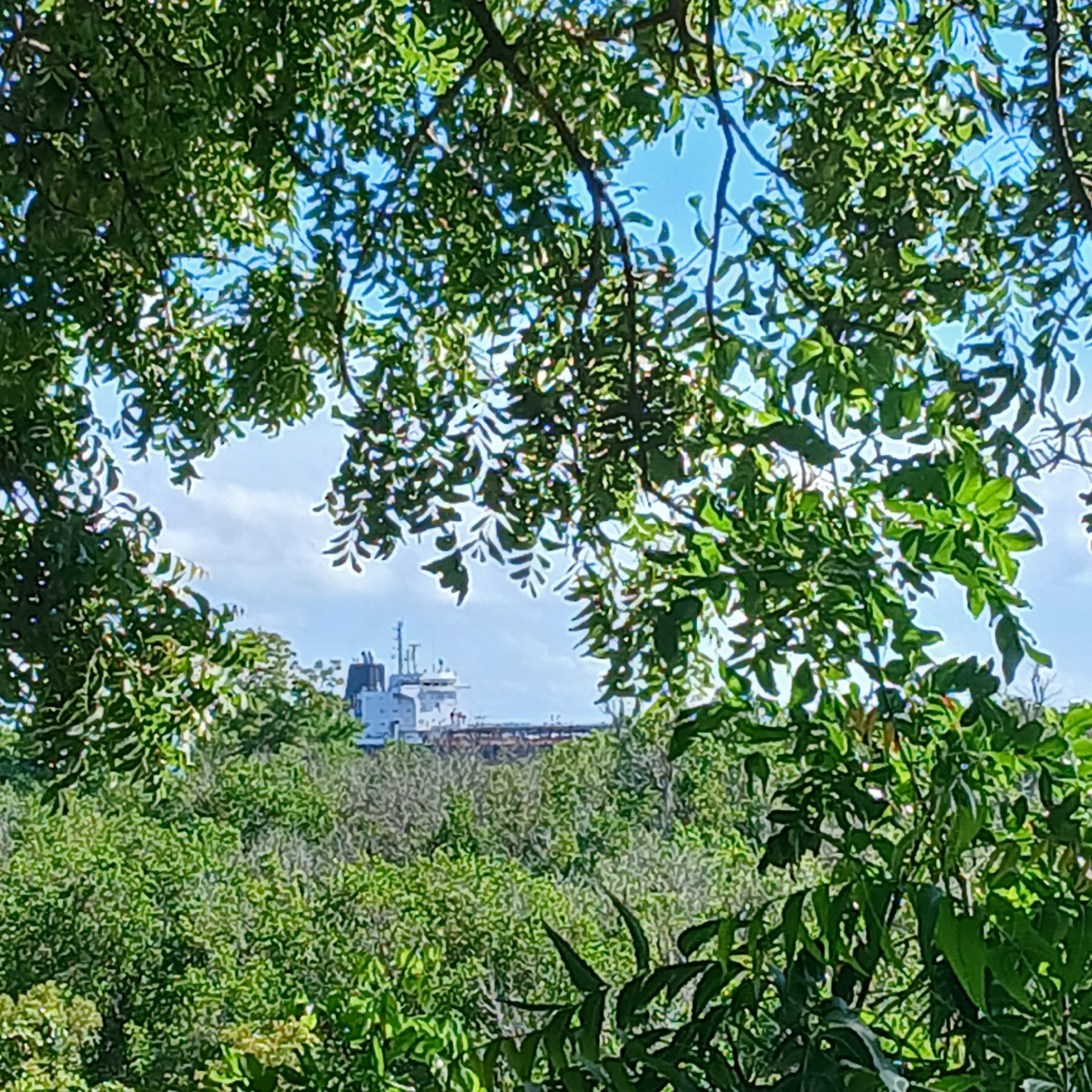 The image displays a distant, large cargo or tanker vessel seen through an irregular frame of dense green foliage in the immediate foreground. The vessel, featuring a white hull and superstructure wit…read more
