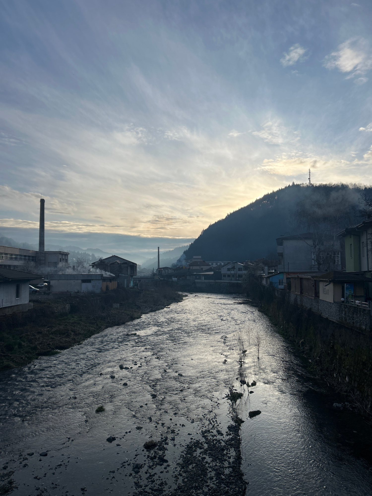 The image depicts a river flowing through the city of Zlatograd, Bulgaria, with a mountainous backdrop. The river, murky in color, fills the right half of the frame. Sunlight reflects off its surface.…read more