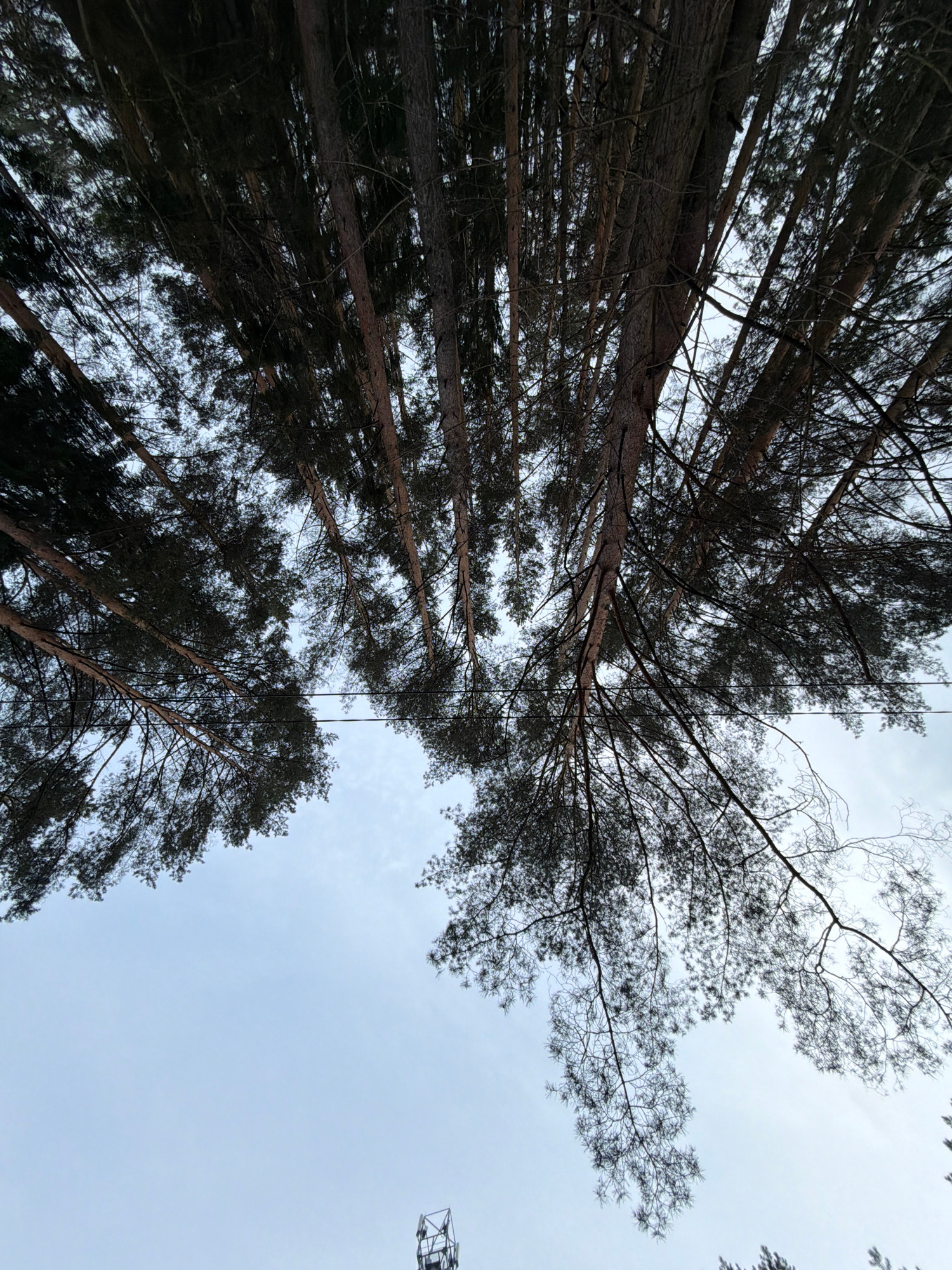 The image depicts a low-angle shot looking up into a dense forest. Tall trees with dark trunks and branches fill most of the frame. The trees are so close together that only glimpses of the overcast s…read more