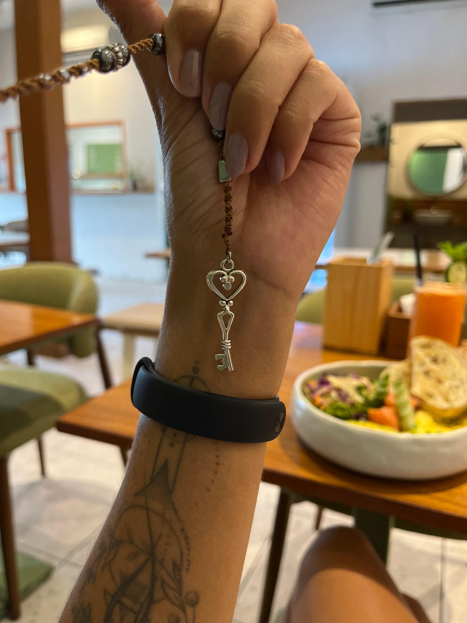 Here's a detailed description of the image: **Scene:** The image appears to be taken indoors, likely in a restaurant or cafe setting. The foreground features a person's arm and hand, adorned with jew…read more