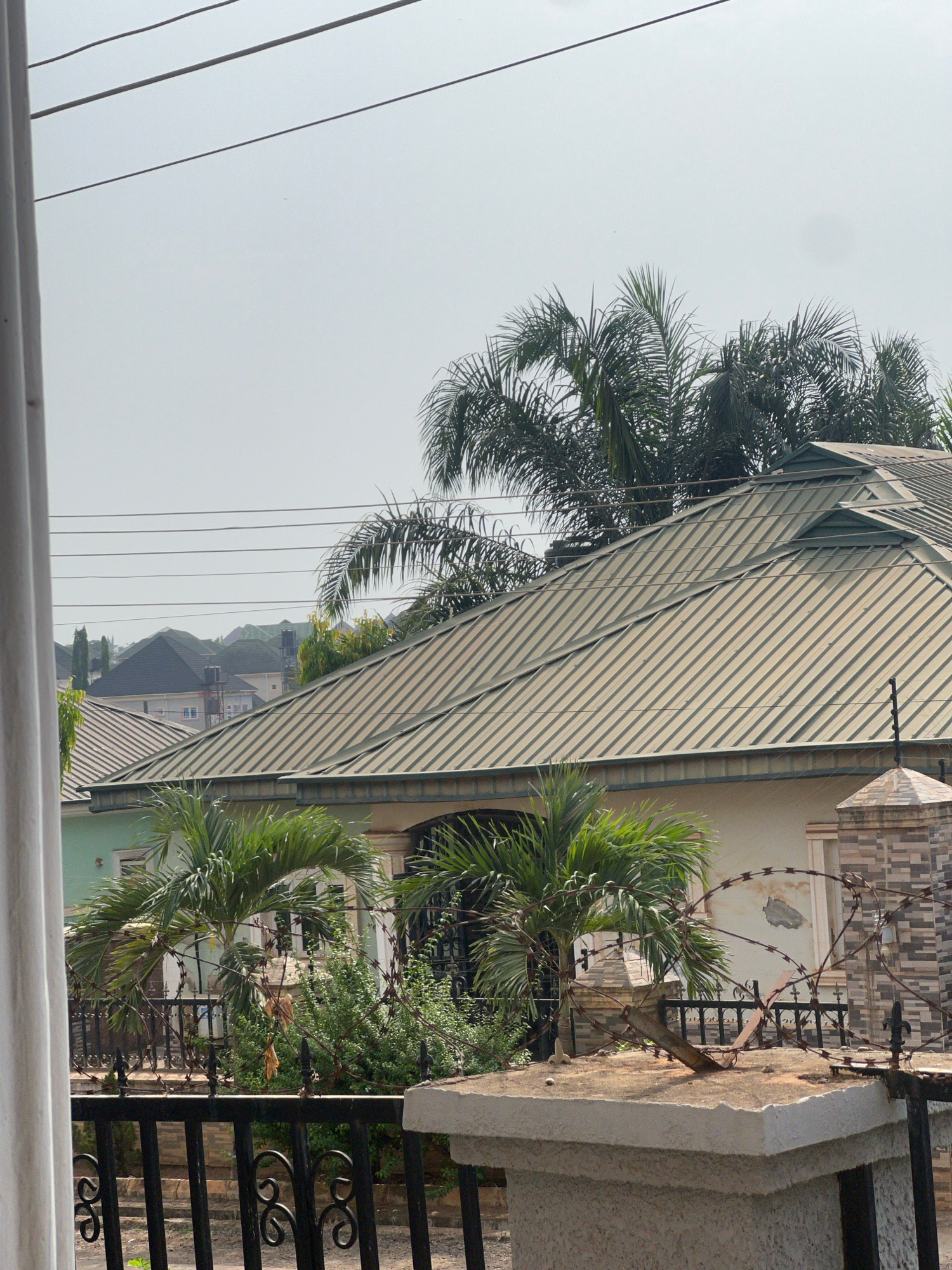 The image shows a view from a higher vantage point, likely a balcony or elevated window, looking out at a residential area. The foreground features a gray railing. In the middle ground, there's a buil…read more