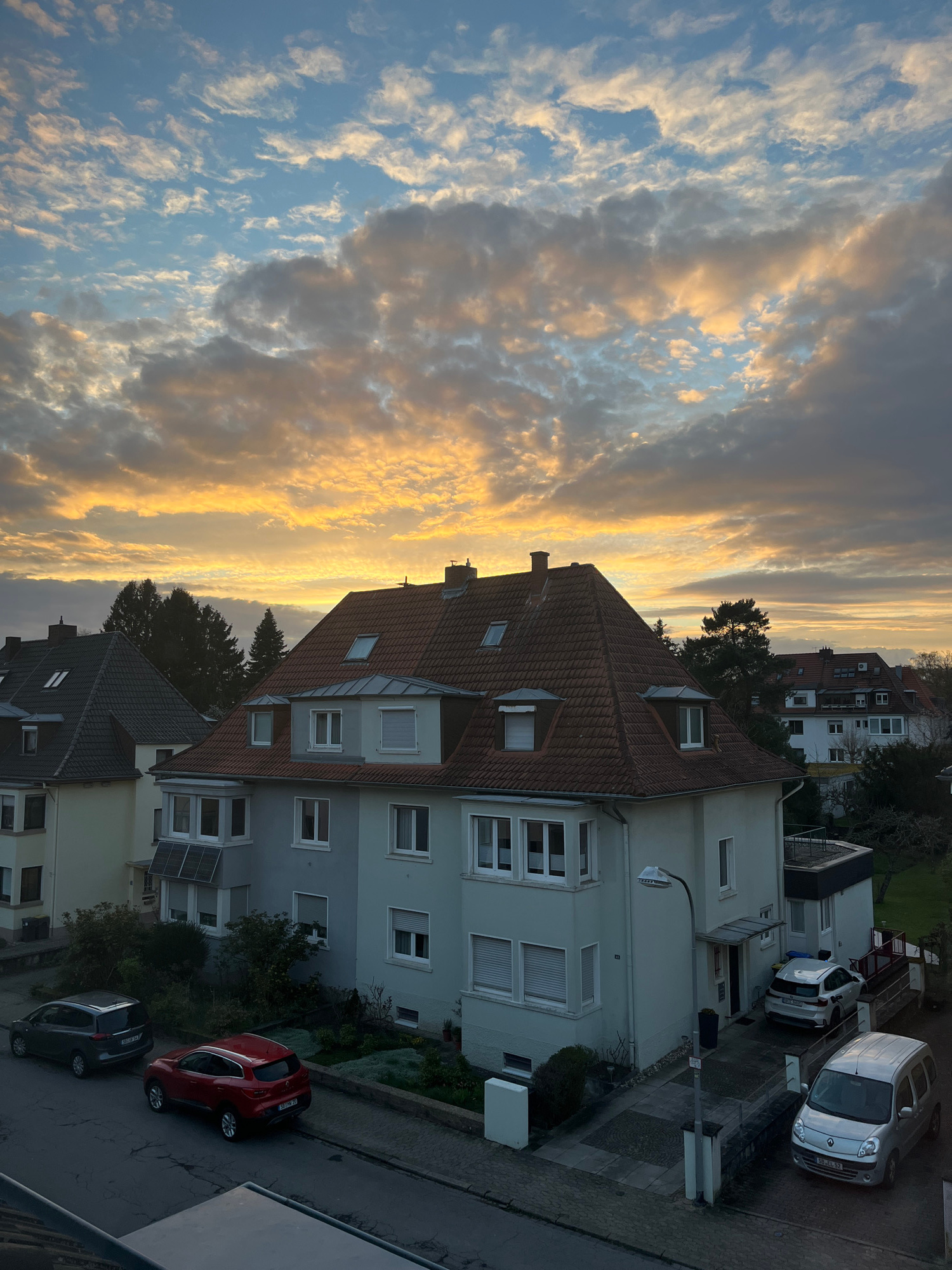The image depicts a residential scene at dusk or dawn in Saarbrücken, Germany. The sky is filled with clouds illuminated by a warm, golden light. Below the sky, several multi-story buildings with red-…read more