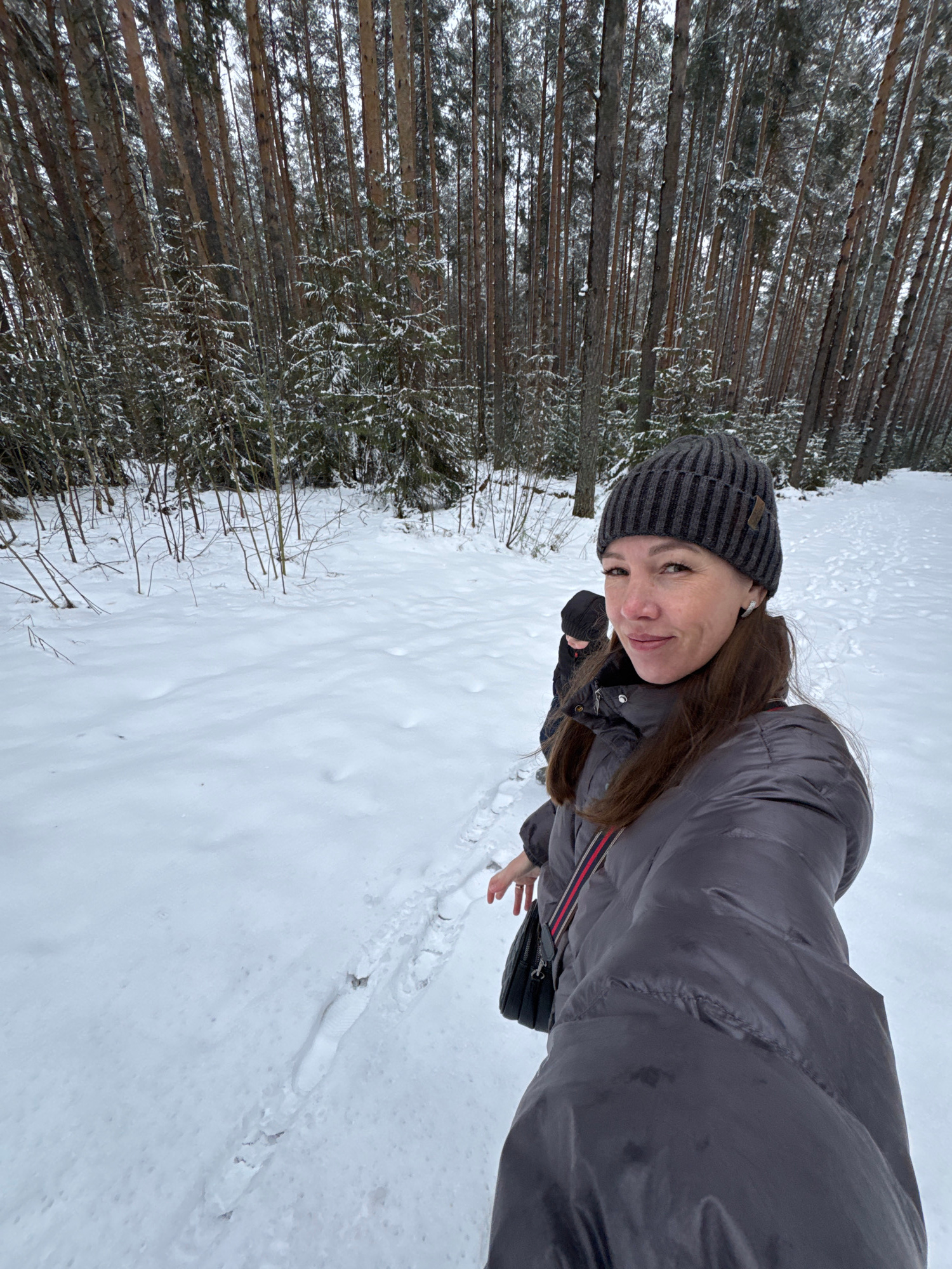 A woman in a gray jacket and striped beanie stands in a snowy environment next to a dense forest. The location is Chaikovsky, Russia. The woman appears to be taking a selfie. Her left hand is gloved.…read more