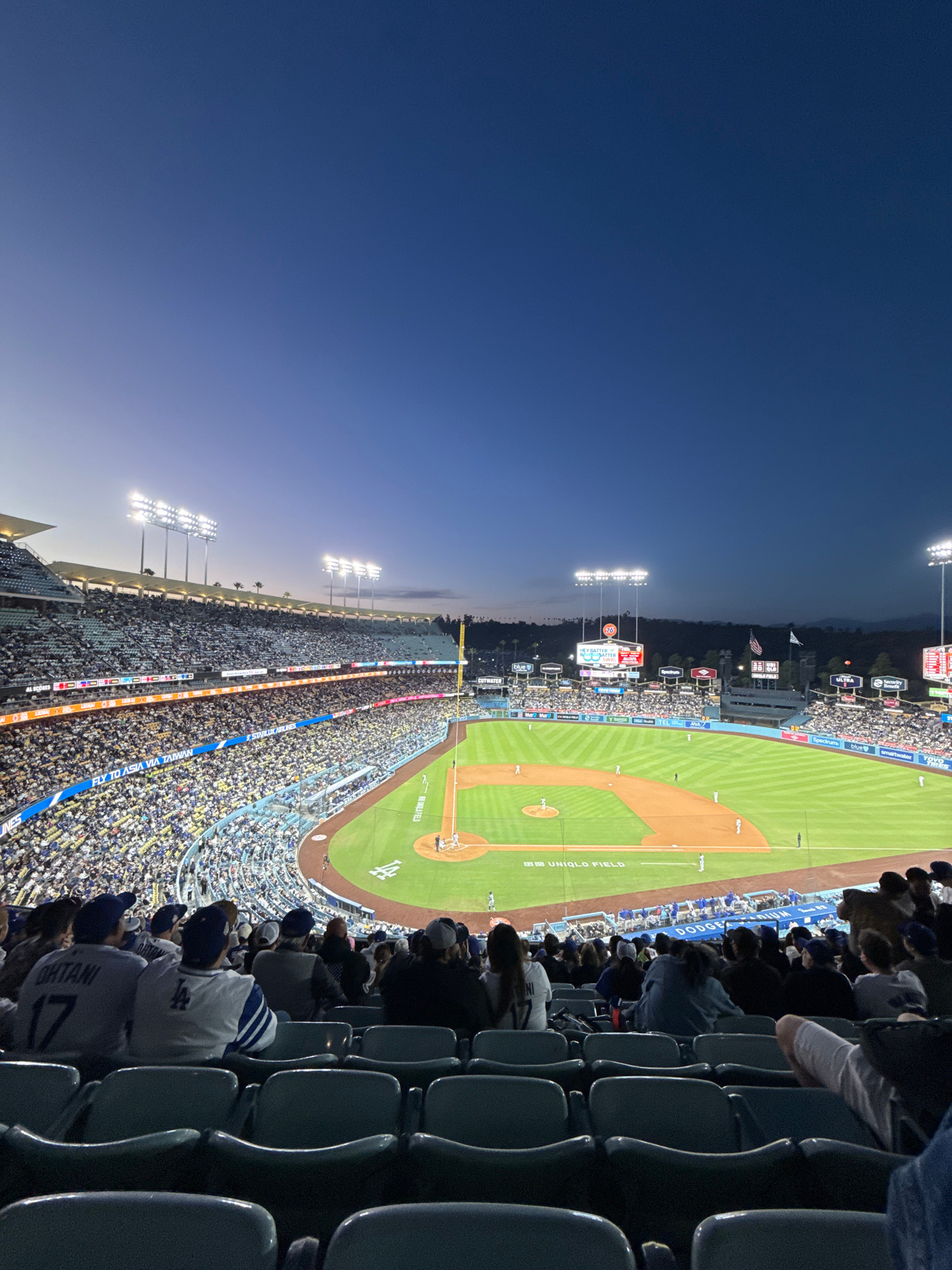 This image shows a baseball game at Dodger Stadium in Los Angeles, California. The stadium is full of spectators. The baseball field is visible with various markings and the word "UNIQLO FIELD". The s…read more