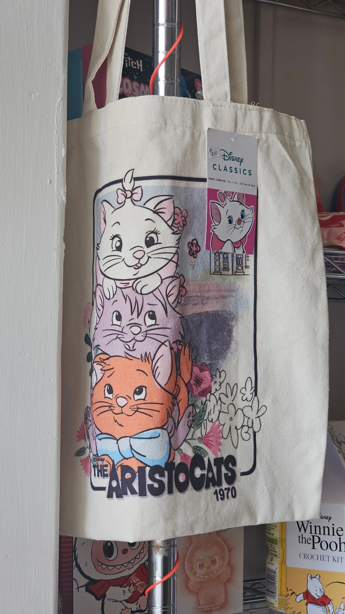 A close-up shot shows a white tote bag with a print featuring characters from Disney's "The Aristocats" film, placed on a shelf, seemingly within a residential setting. The tote bag is a light, off-wh…read more