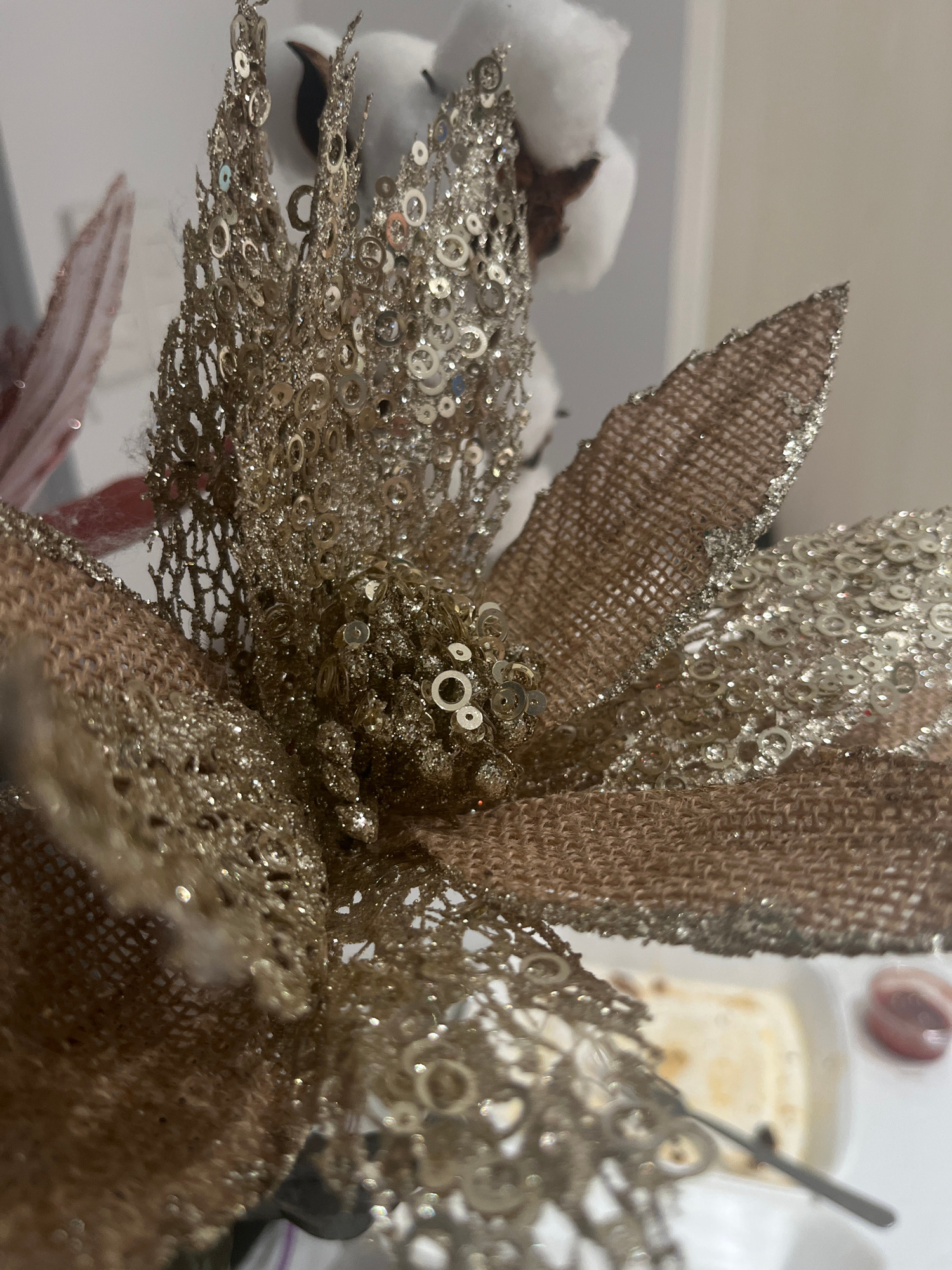 The image presents a close-up view of a large, artificial flower-like decoration. The primary subject is crafted from a textured, golden-brown fabric that resembles burlap, heavily embellished with sp…read more