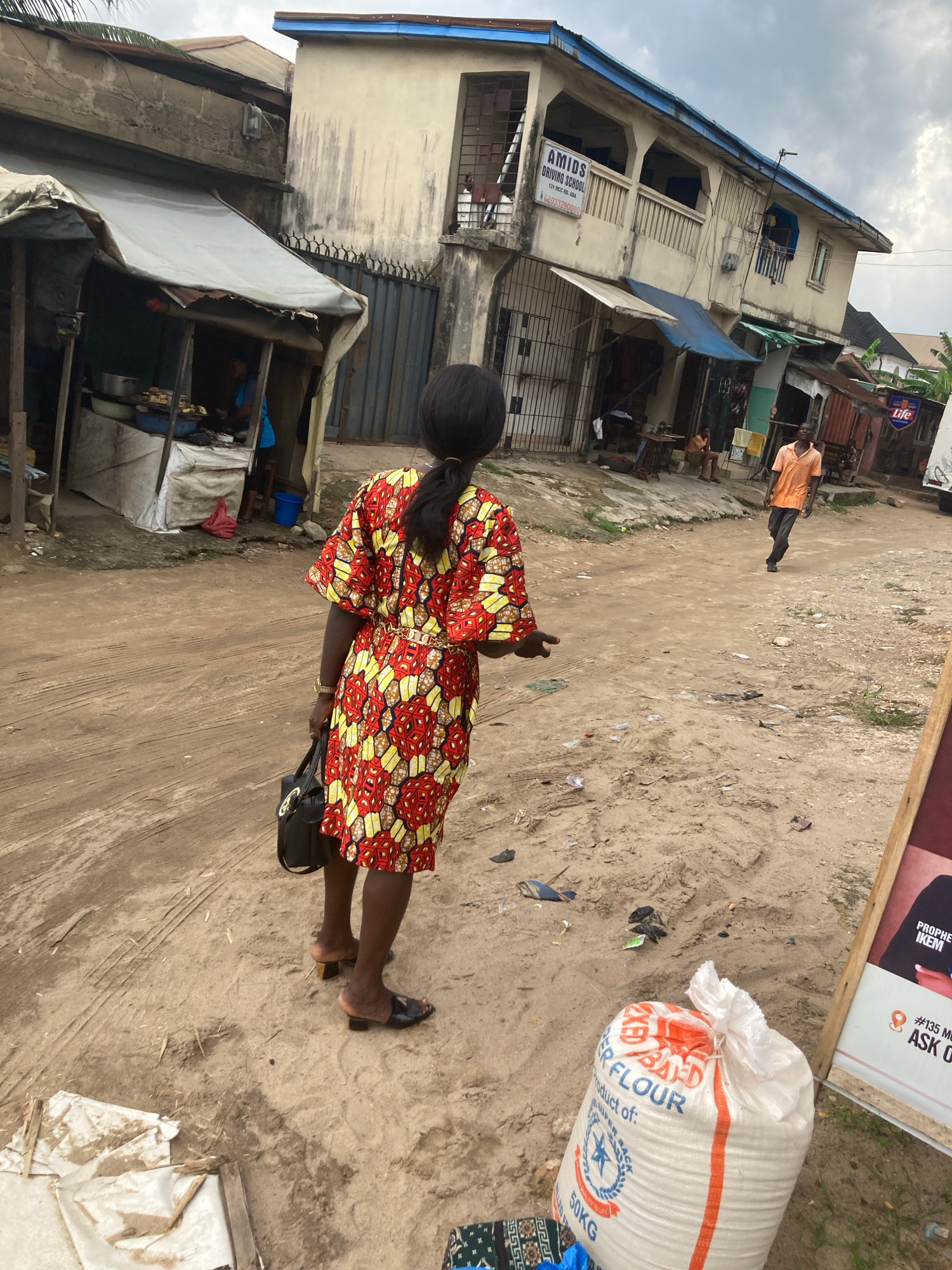 Here is a description of the image: The image captures a scene in Aba, Nigeria, characterized by a sandy, unpaved road littered with trash. In the foreground, a woman in a vibrant red and yellow patt…read more