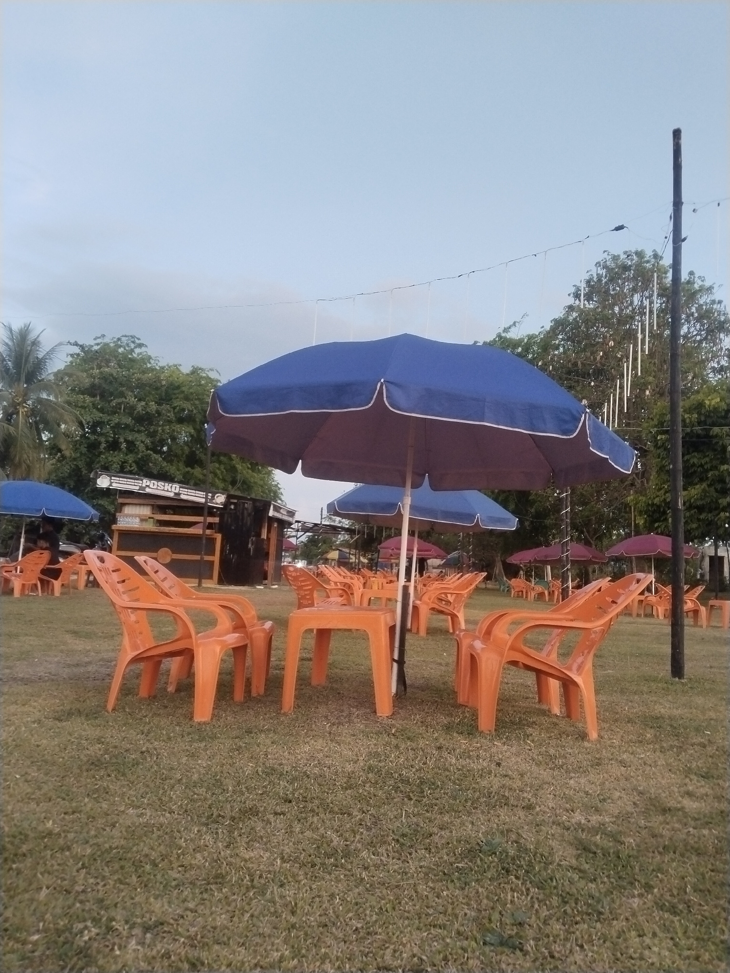 The image shows an outdoor seating area in what appears to be a park or recreational space. Several orange plastic chairs and tables are arranged under blue and maroon umbrellas on a grassy lawn. A sm…read more