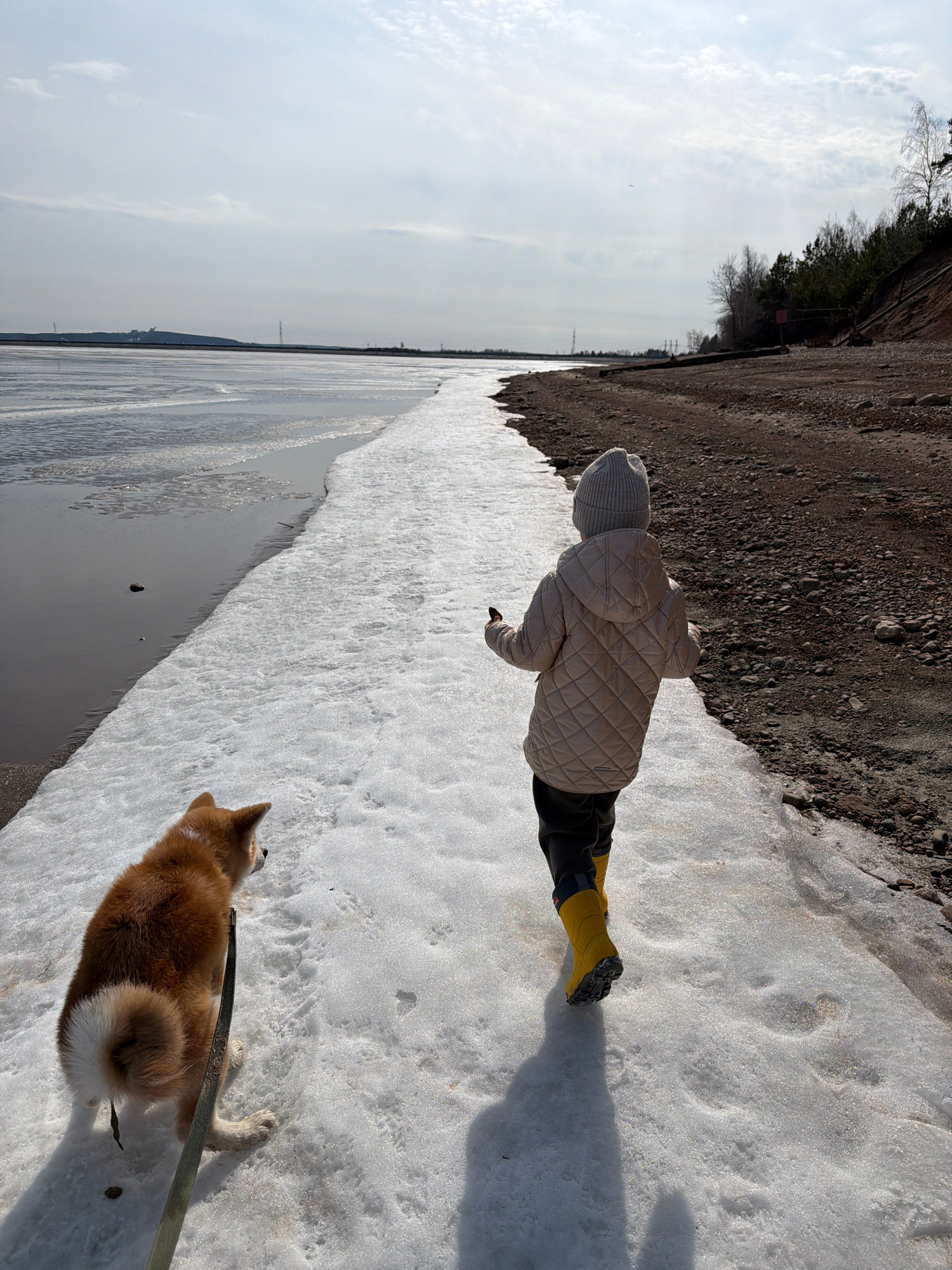 A person wearing a light-colored quilted jacket, dark pants, a gray hat, and yellow rubber boots stands on a snow-covered ground next to a frozen body of water. An Akita Inu dog is leashed nearby. The…read more