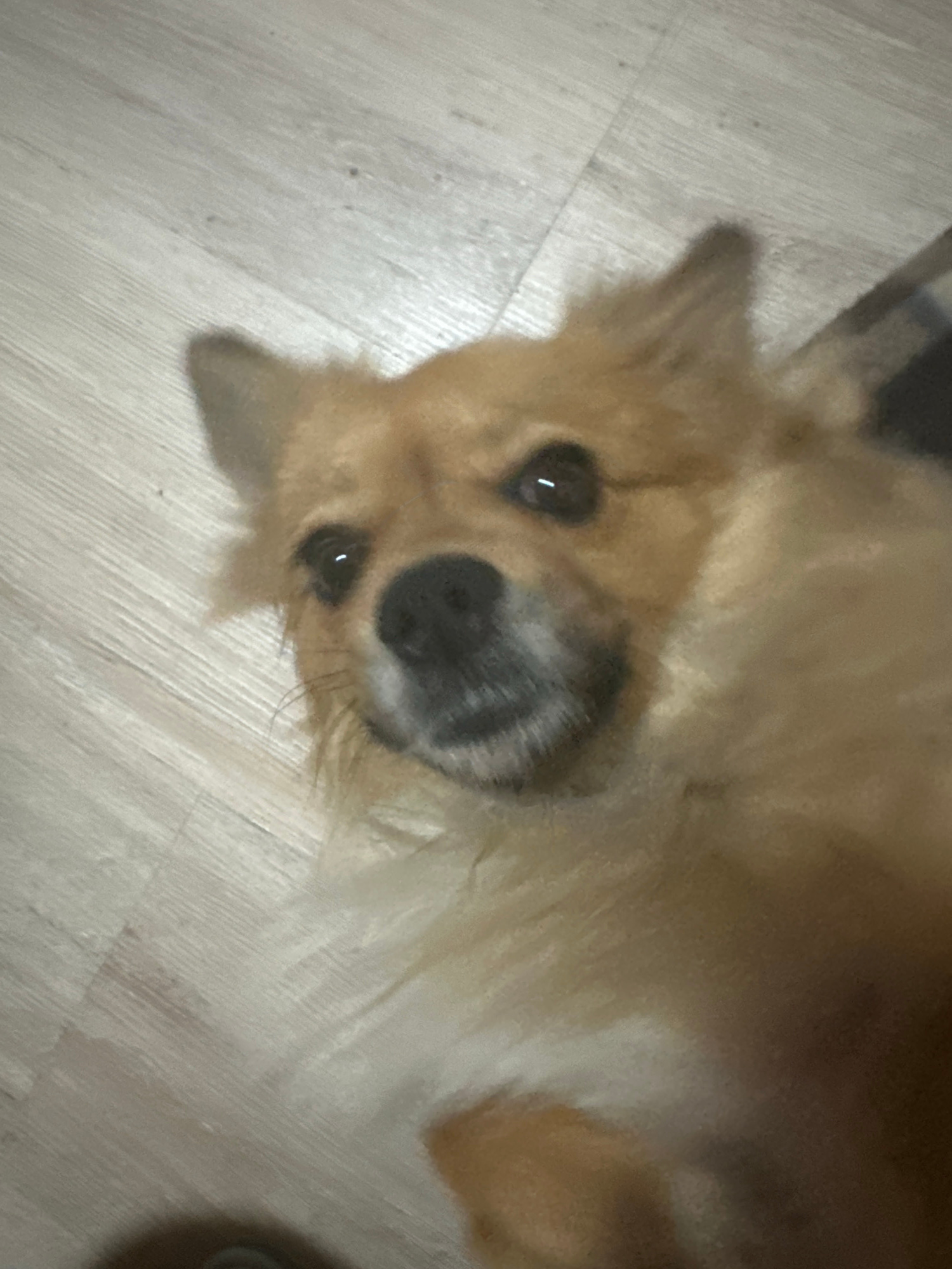 A medium-sized, tan-colored dog with a black nose and brown eyes is lying on its side on a light-colored, wood-look floor. The dog's head is in focus, and part of its body is slightly blurred. The bac…read more