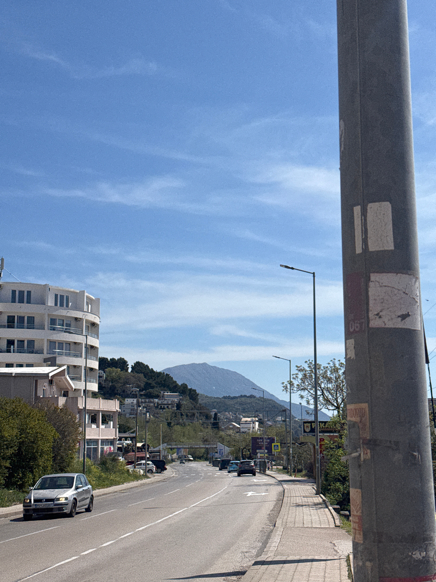 The image depicts a street scene in Sutomore, Montenegro. A gray utility pole runs along the top left of the image. The right side of the image shows a two-lane asphalt road with a solid white line di…read more