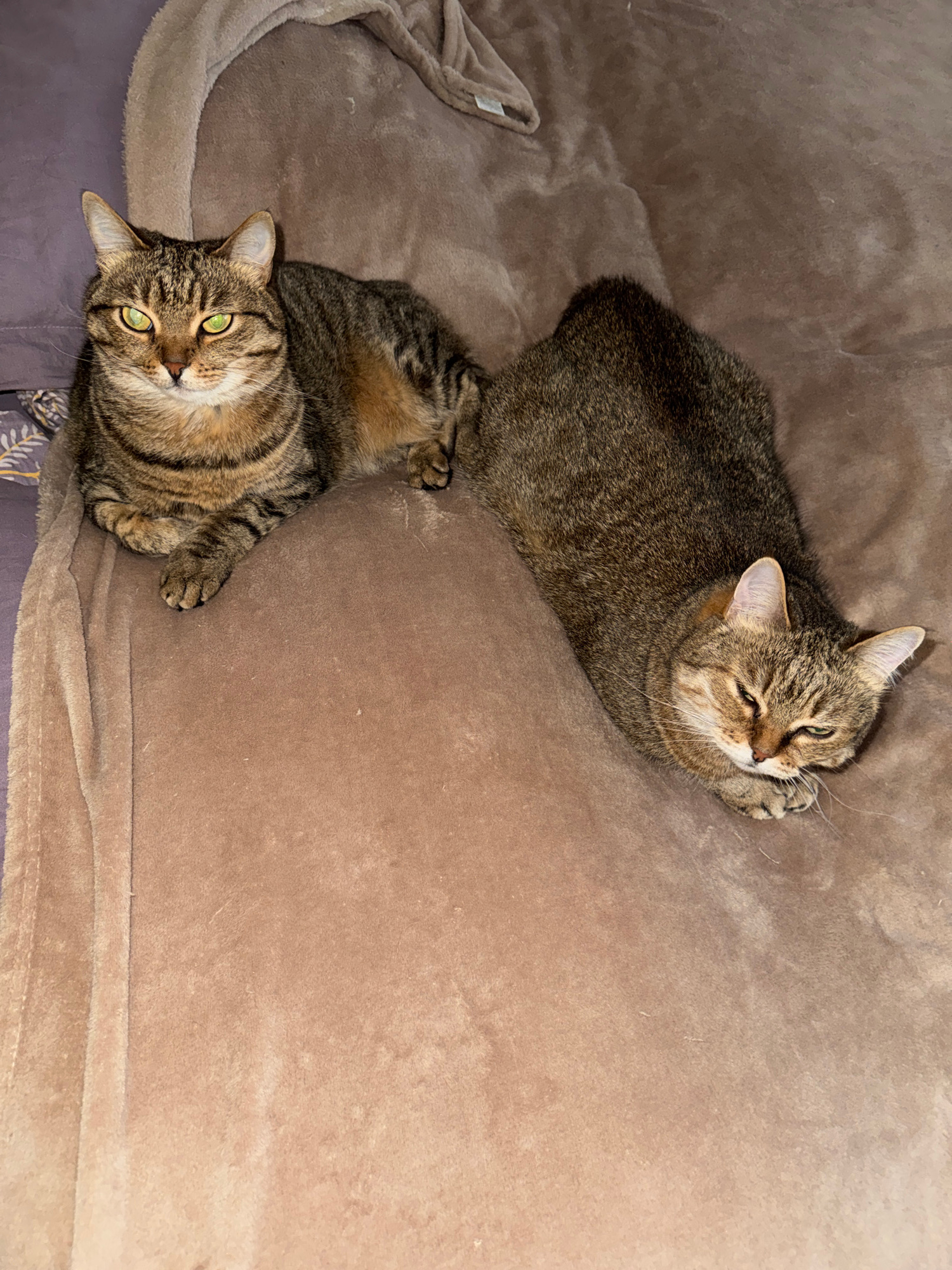 Two tabby cats are resting on a brown plush blanket. One cat is lying with its head near the top right corner of the image, eyes mostly closed and its paws near its face. The second cat is positioned…read more