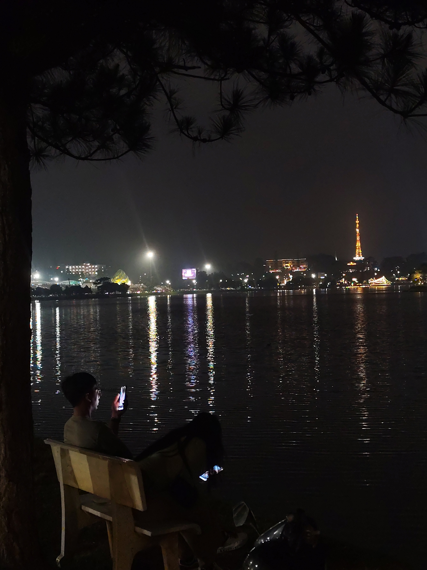 A dimly lit, wide-angle shot captures a nighttime scene at Ho Xuan Huong Lake in Da Lat, Vietnam. In the foreground, a person sits on a wooden bench under a tree, holding and looking at a mobile phone…read more