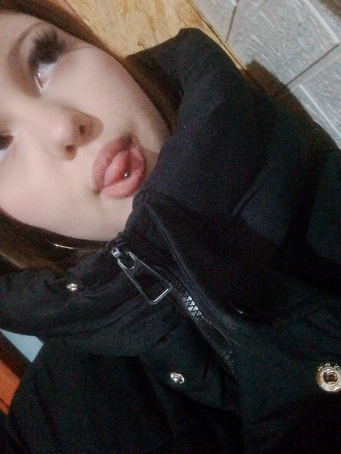 A close-up, tilted photograph depicts an individual, likely female, partially visible from the chest up in an indoor setting. The subject has dark hair and is wearing a black garment, possibly a jacke…read more