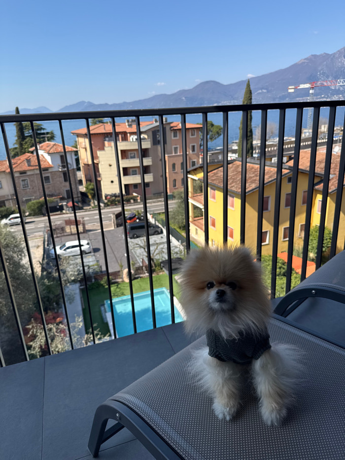 A light-colored, fluffy Pomeranian dog, wearing a dark grey knitted sweater, sits upright on a grey mesh lounge chair on an outdoor balcony in Albisano, Italy. The balcony features a dark grey tiled f…read more