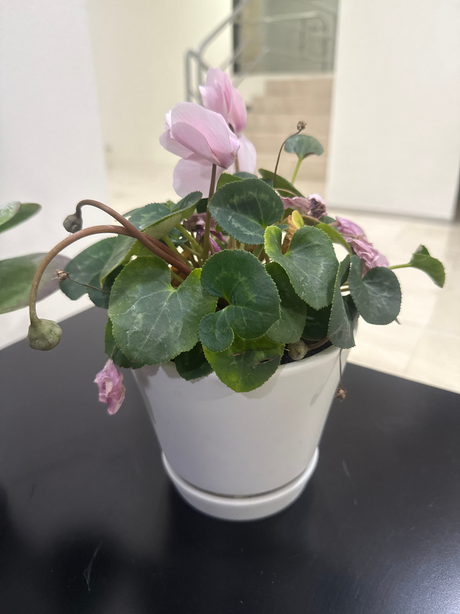 A cyclamen plant in a white pot rests on a surface that is half black and half white. The plant has green leaves and pink flowers, some of which appear to be wilting. There are also some closed buds w…read more