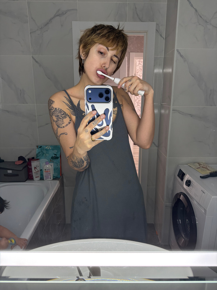 The image depicts a mirror selfie taken in a private bathroom. The primary subject is an adult individual with short, light brown hair, visible multiple ear piercings, and a nose ring. They are wearin…read more