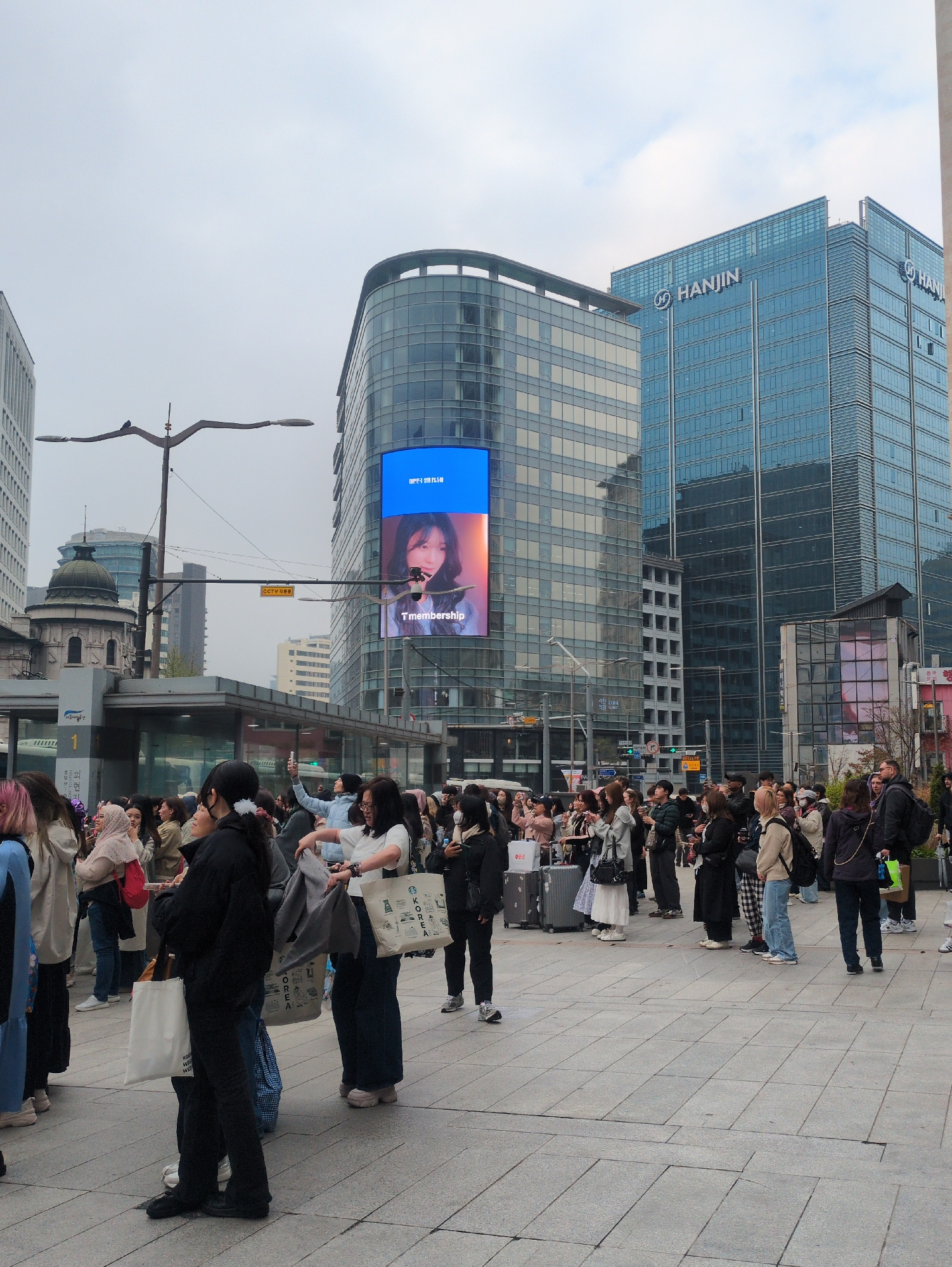 Here is a detailed description of the image: **Environment:** The photo appears to be taken in Seoul, South Korea, as evidenced by the "HANJIN" sign on a modern glass skyscraper and the "KOREA" brand…read more