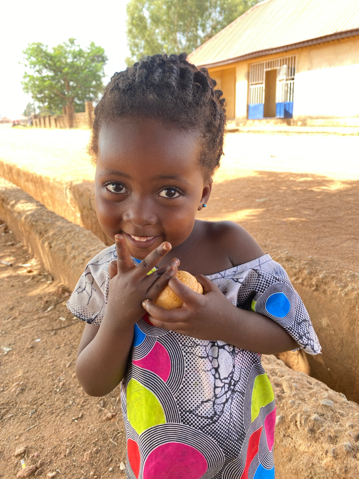 A young, dark-skinned child with braided hair is captured in a vibrant, close-up portrait, looking directly at the camera with a wide, joyful smile. The child is wearing a colorful dress featuring lar…read more