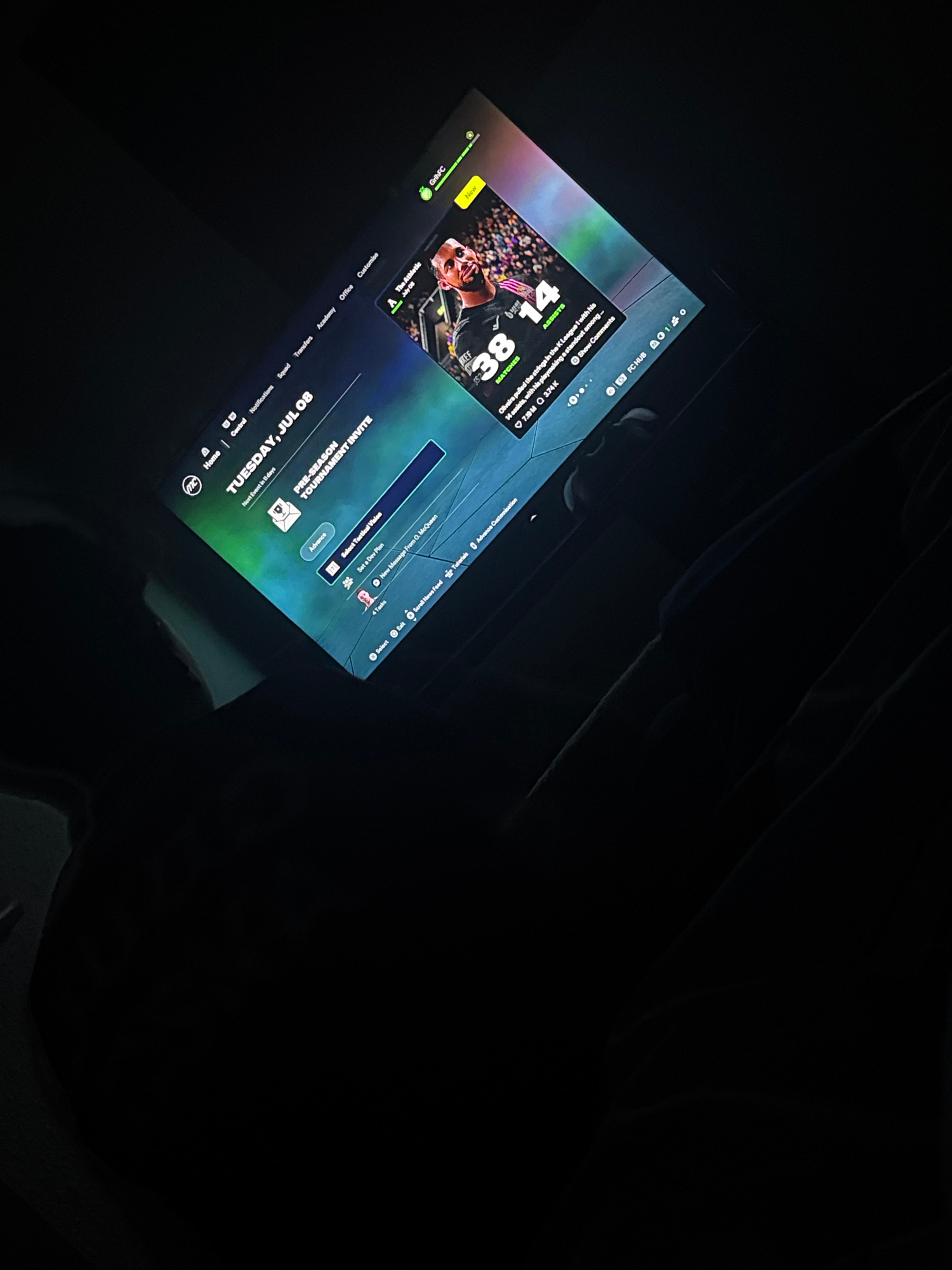A tilted, dim image shows a screen with a game open, set on Tuesday, July 08. The interface includes options for Squad, Transfers, Academy, and Office. The game's name is difficult to discern but may…read more