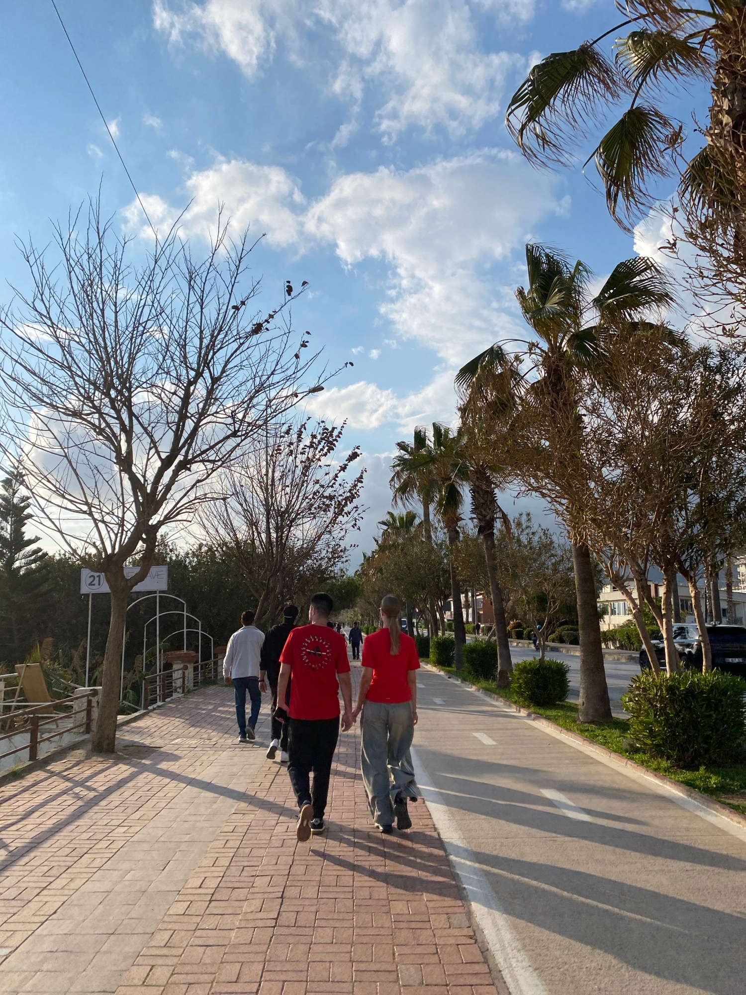 A medium-shot, outdoor scene in Alanya, Turkey, depicting a group of people walking along a brick sidewalk adjacent to a paved road lined with trees. Two individuals in red shirts are in the foregroun…read more