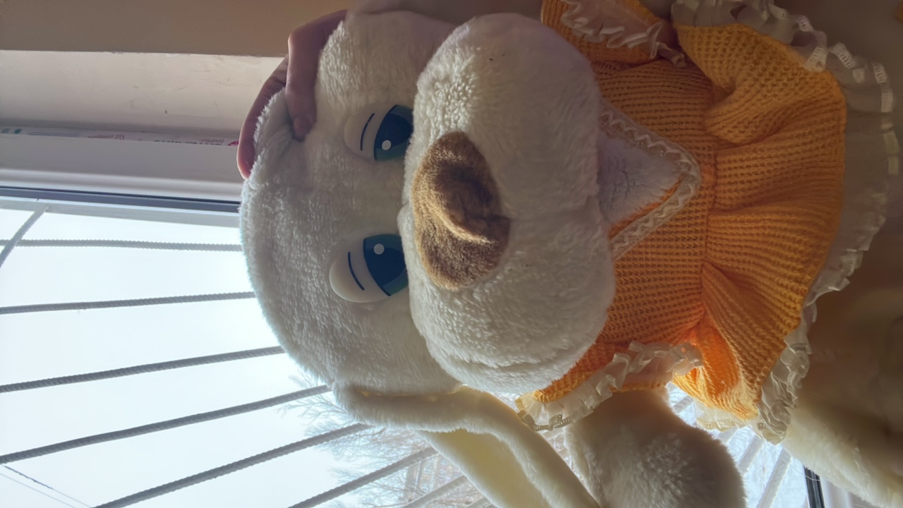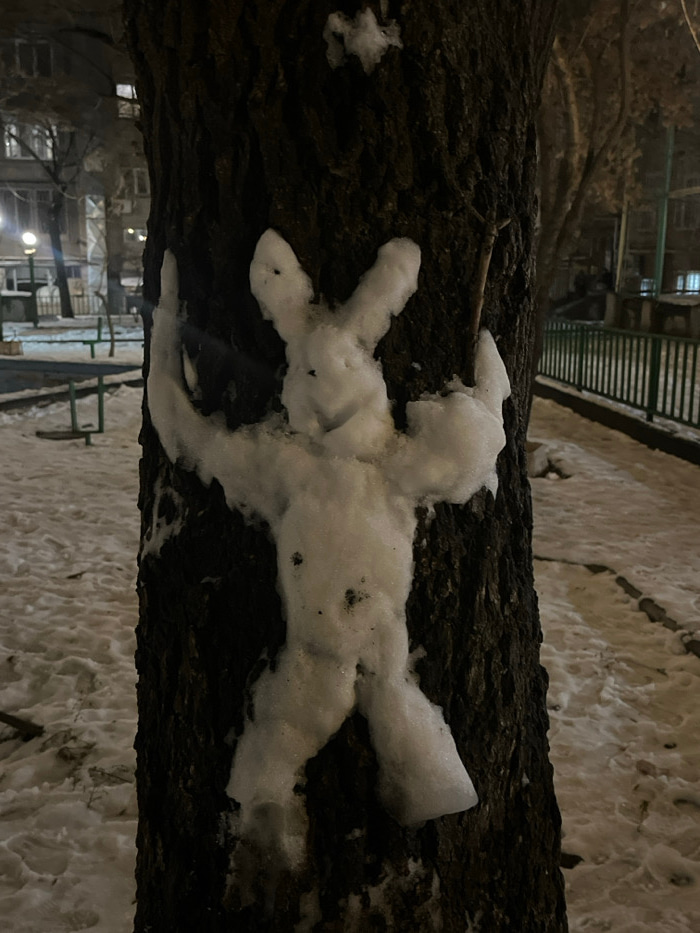 A tree trunk lies horizontally in the center. On top of the trunk is a white snow figure resembling an abstract humanoid shape with four limbs. The background is blurred and shows a snowy ground, buil…read more