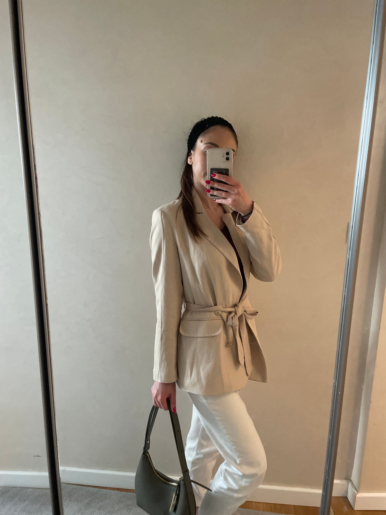 A person in a beige jacket and white pants is taking a selfie in a mirror. They are holding a smartphone in their left hand and a dark green handbag in their right. The mirror is framed and reflects a…read more