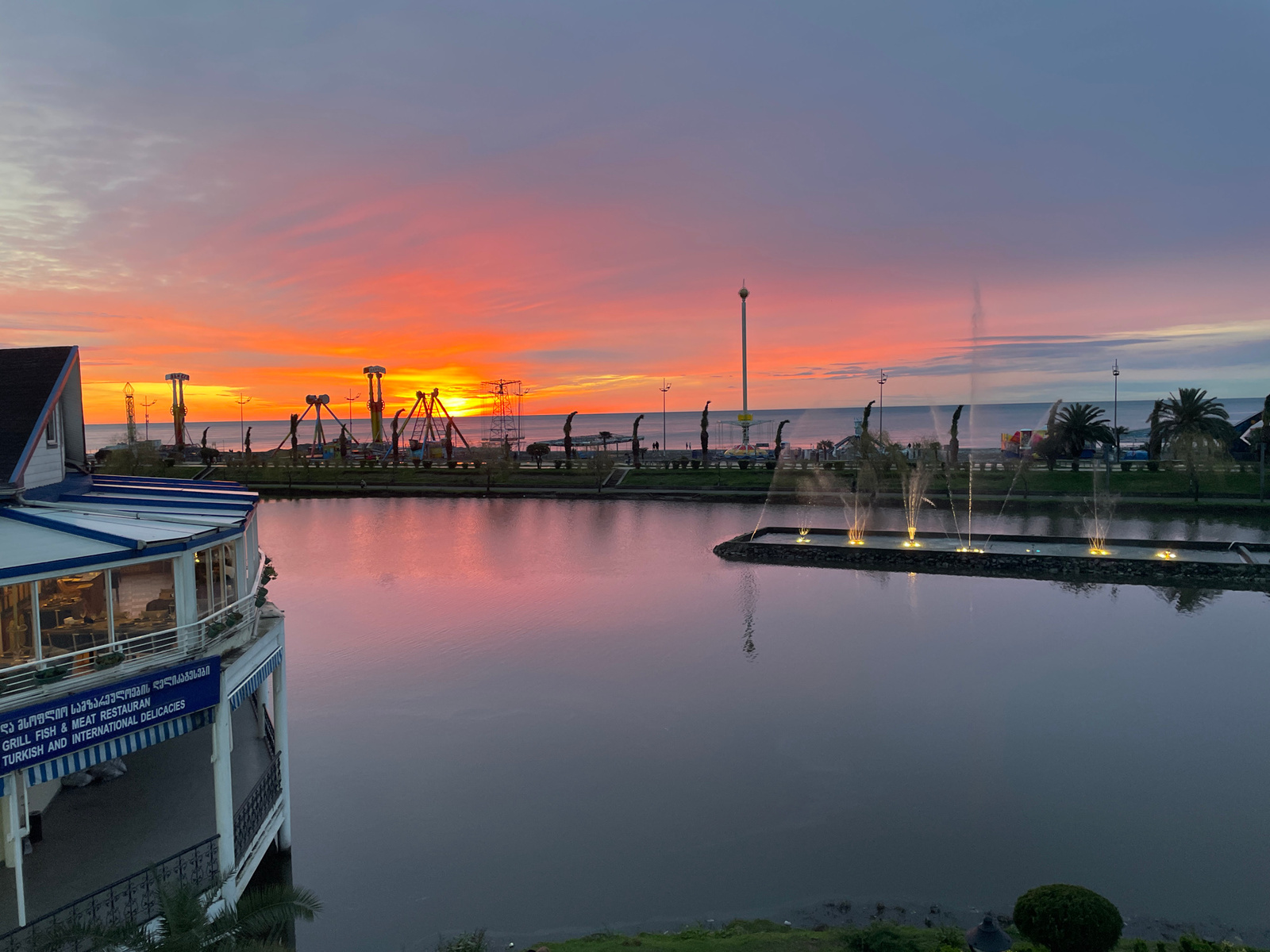 The image shows a sunset view in Batumi, Georgia, overlooking a lake. The sky is a gradient of orange, pink, and purple. On the left, a partially visible building with a restaurant sign is situated. T…read more