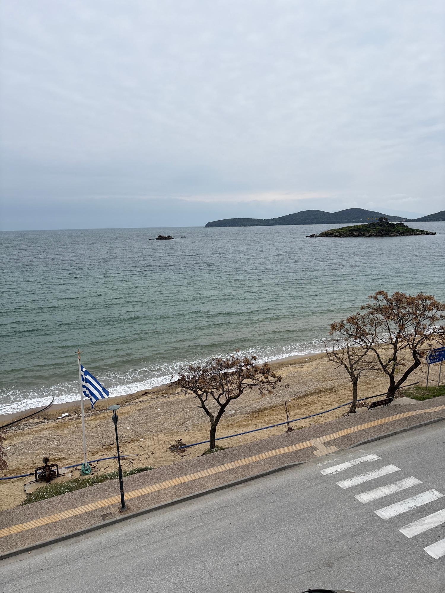 The image presents a view of the coastline in Nea Peramos, Greece. The scene is captured from an elevated perspective, possibly from a building overlooking the beach. The sea occupies a significant pā¦read more
