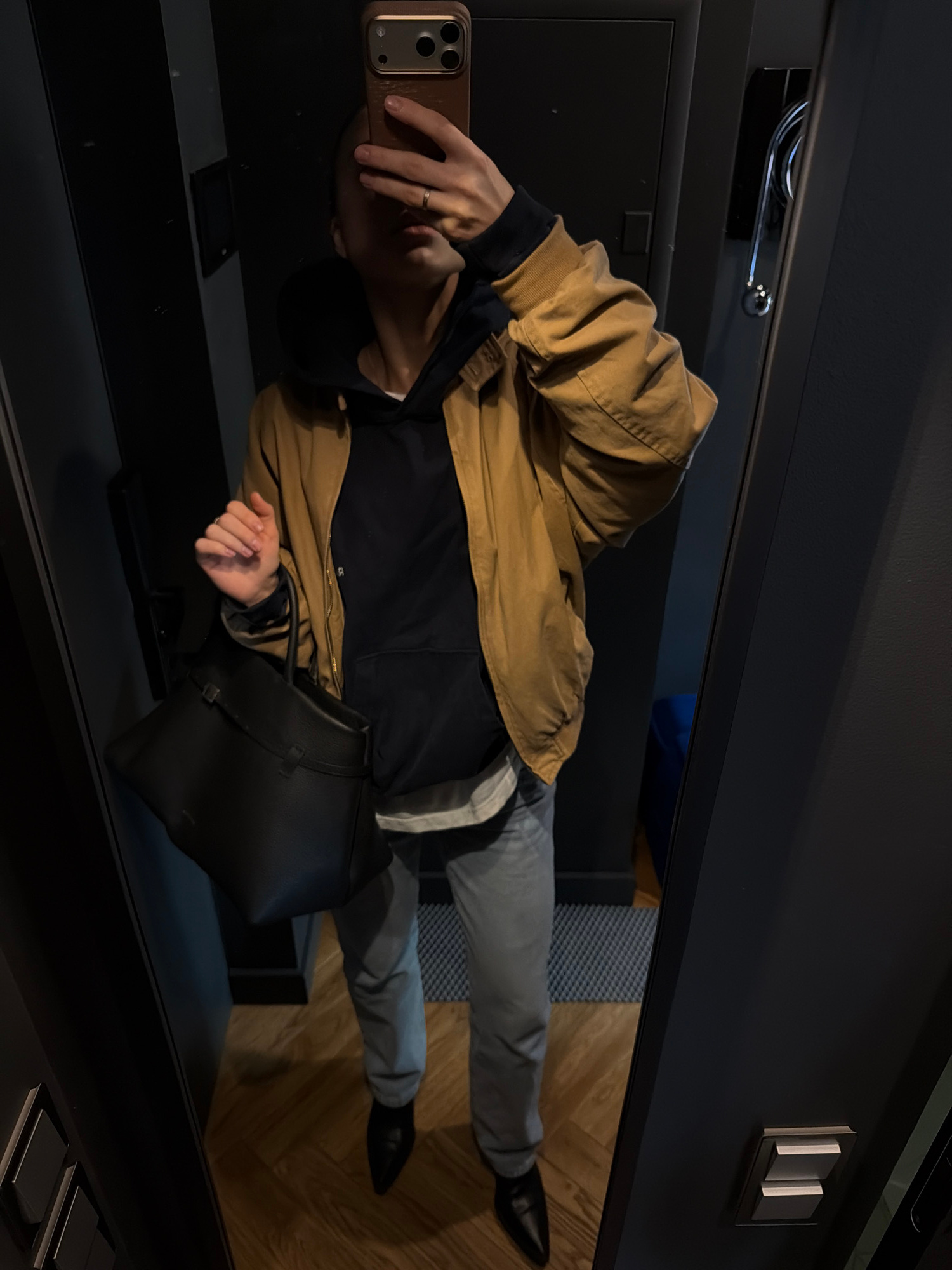 A person stands inside what appears to be a Sleeper Bus Capsule Hotel in Moscow, Russia, taking a selfie with a smartphone. The person is wearing a tan jacket, a black shirt, grey pants, and black sho…read more