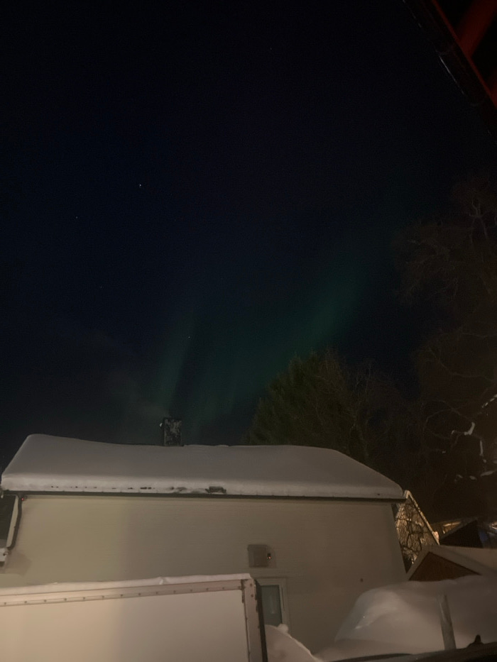 A low-angle view captures a dark sky displaying the aurora borealis with green hues. Trees are silhouetted in the upper portion. A snow-covered, boxy white structure occupies the right side of the fra…read more