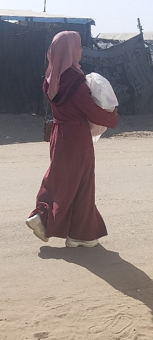 A female individual is depicted walking from left to right across an unpaved, light brown sandy surface under clear daylight in Khan Yunis, Palestinian Territory. She is attired in a long-sleeved, ful…read more