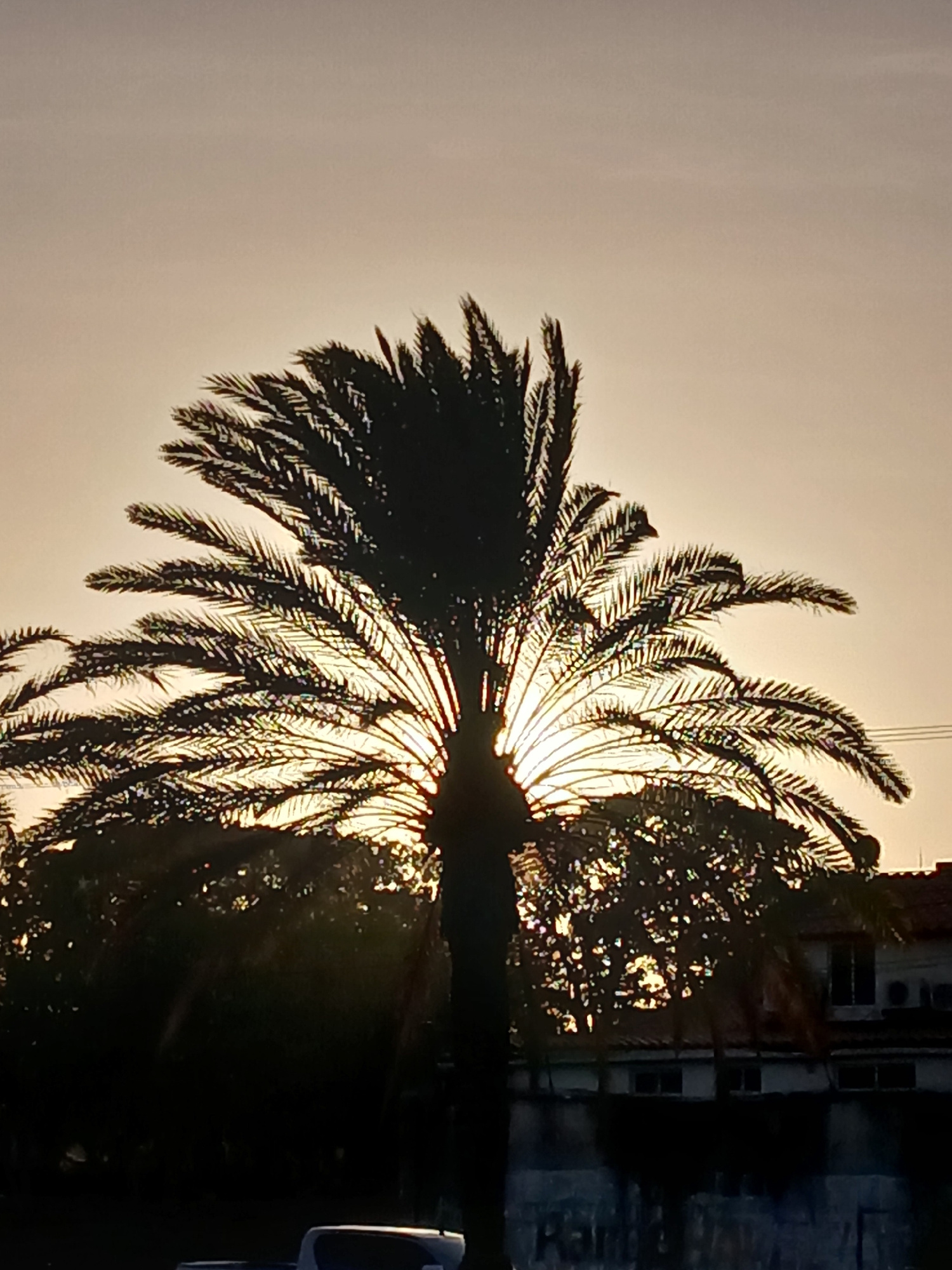 The image shows a palm tree silhouetted against a bright sky, likely at sunset or sunrise. Light rays are visible through the fronds. Behind the palm tree, there's another tree and a building with mul…read more