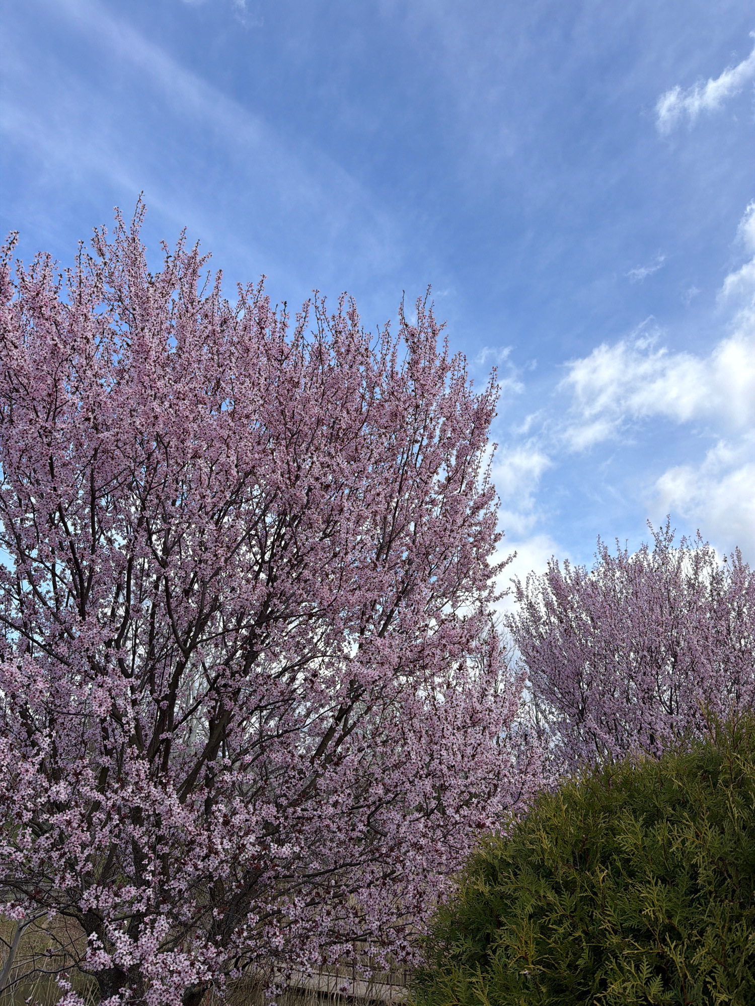 The image displays a view looking up at blossoming trees against a blue sky with scattered white clouds. The trees are covered in light pink flowers. To the right, there's a dark green tree with needl…read more