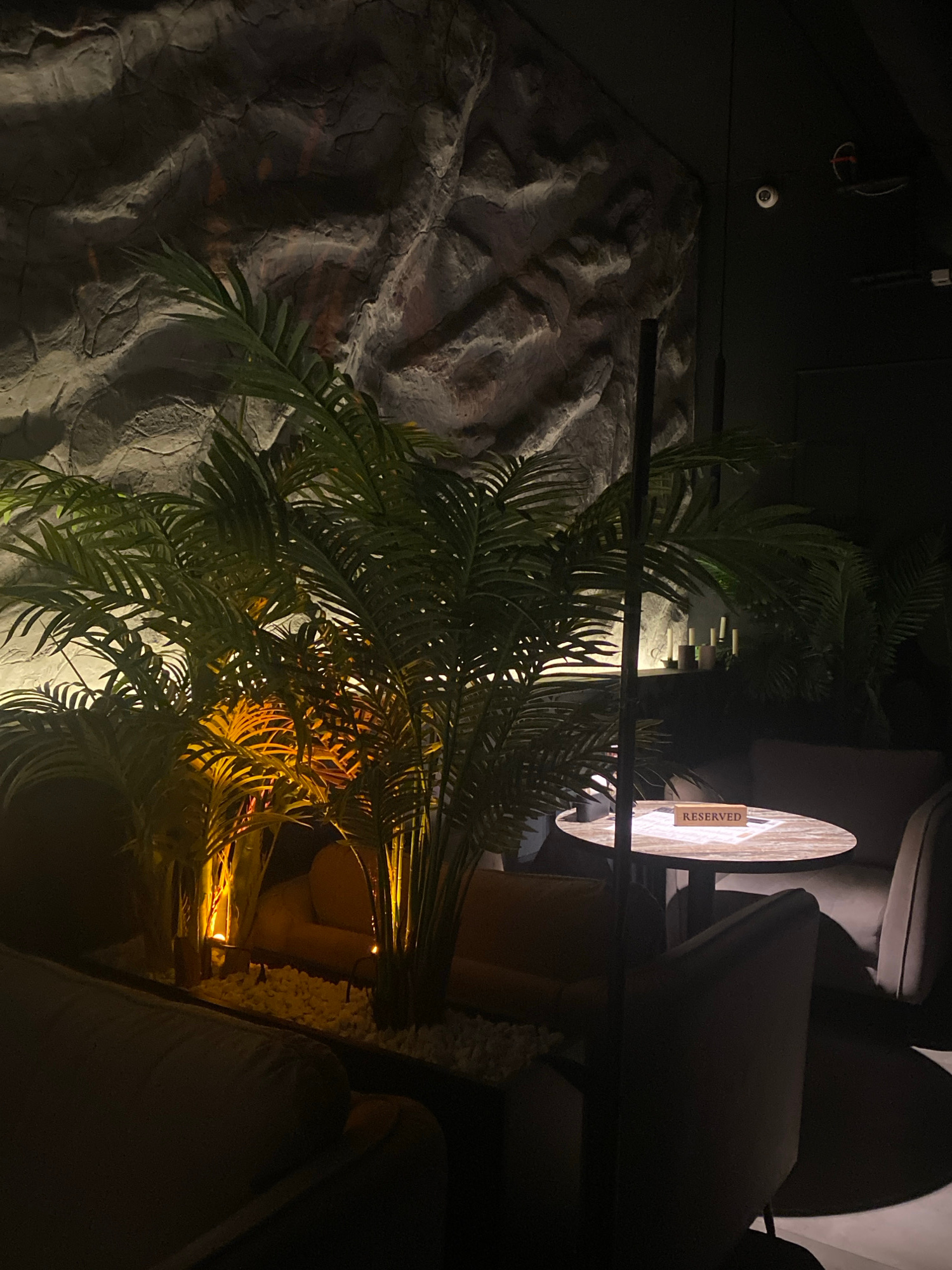 The scene is indoors and dimly lit. A faux palm tree stands between a faux rock wall and a table with chairs. A reserved sign is visible on the table. A security camera is mounted on the ceiling. The…read more
