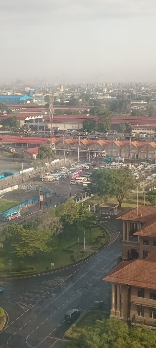 An aerial view shows a city street congested with various vehicles, including buses, flanked by buildings with reddish-brown roofs. A prominent structure with similar roofing is positioned to the righ…read more