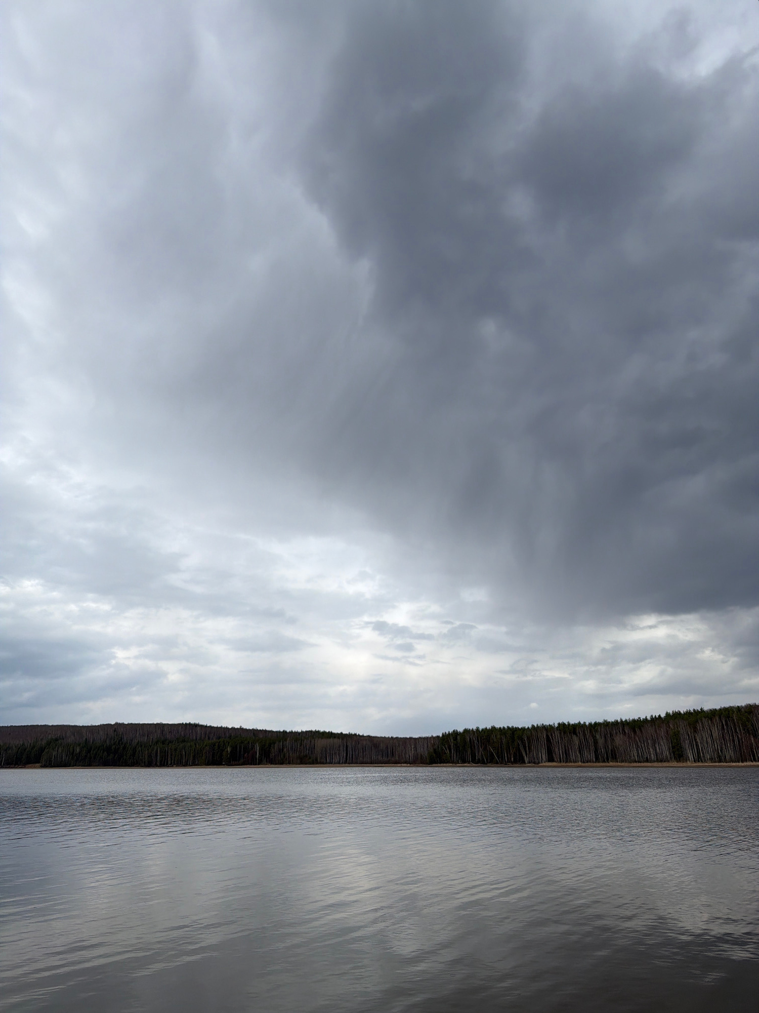 The image depicts a body of water with a forested shoreline under a cloudy sky. The sky is predominantly gray, suggesting overcast conditions. A strip of trees lines the water's edge, appearing dark a…read more
