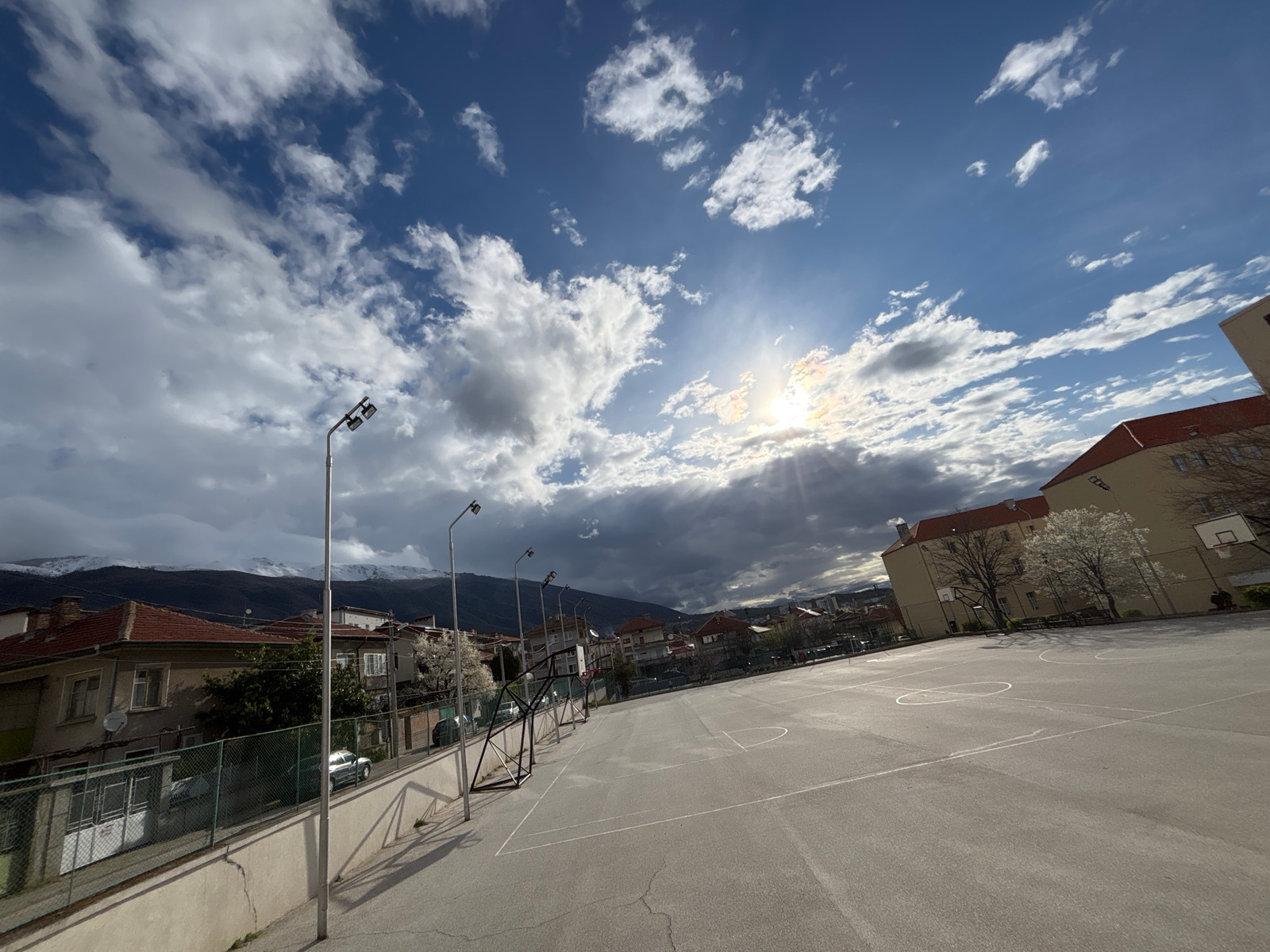The image depicts an outdoor basketball court in Karlovo, Bulgaria. The court is paved and marked with white lines. Several basketball hoops are visible. Buildings with red-tiled roofs are present inβ¦read more