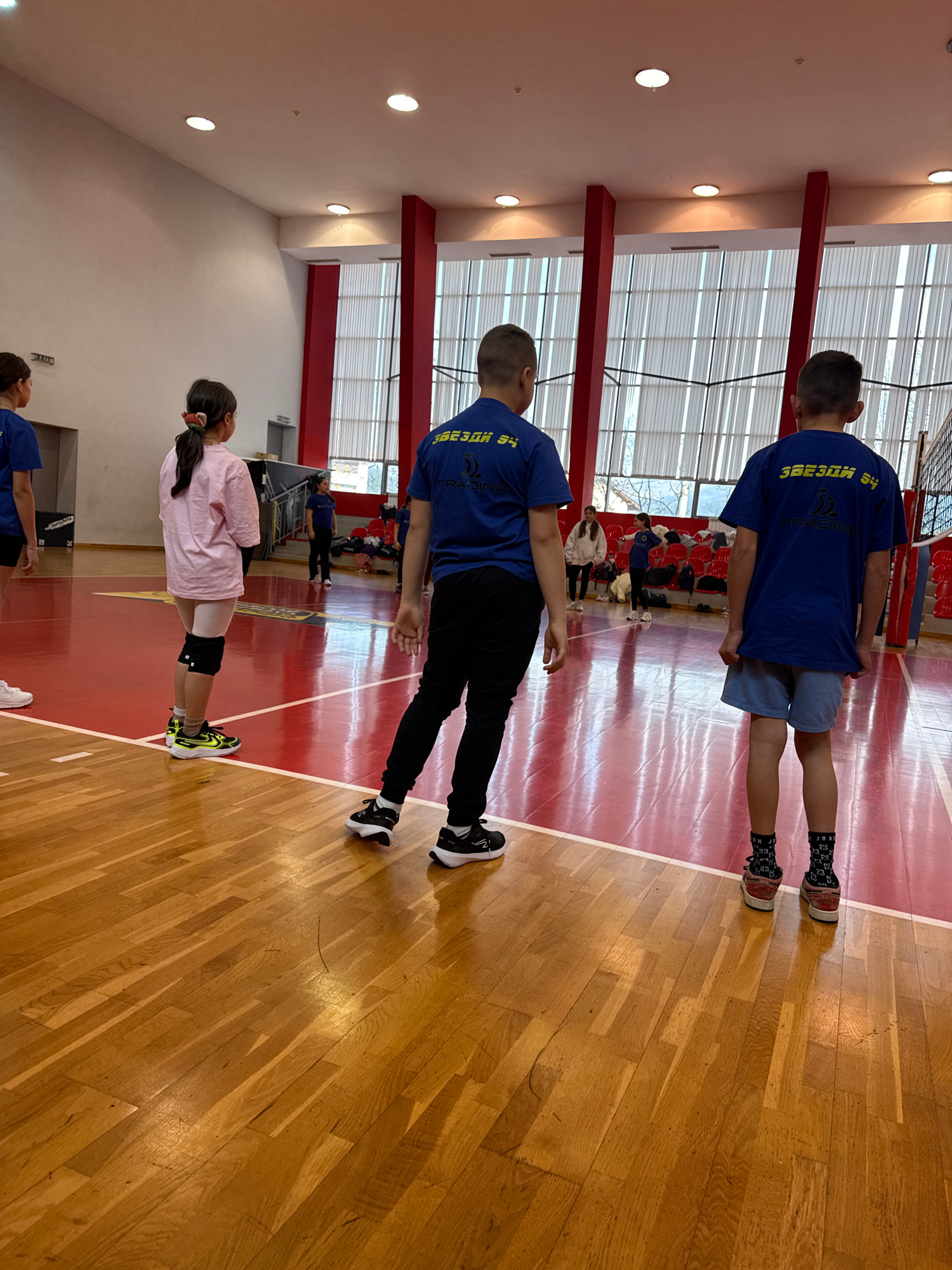 The image shows a group of young people in a gymnasium in Etropole, Bulgaria. Two boys wear blue t-shirts with yellow lettering on the back. One boy wears blue shorts and the other wears black pants.…read more