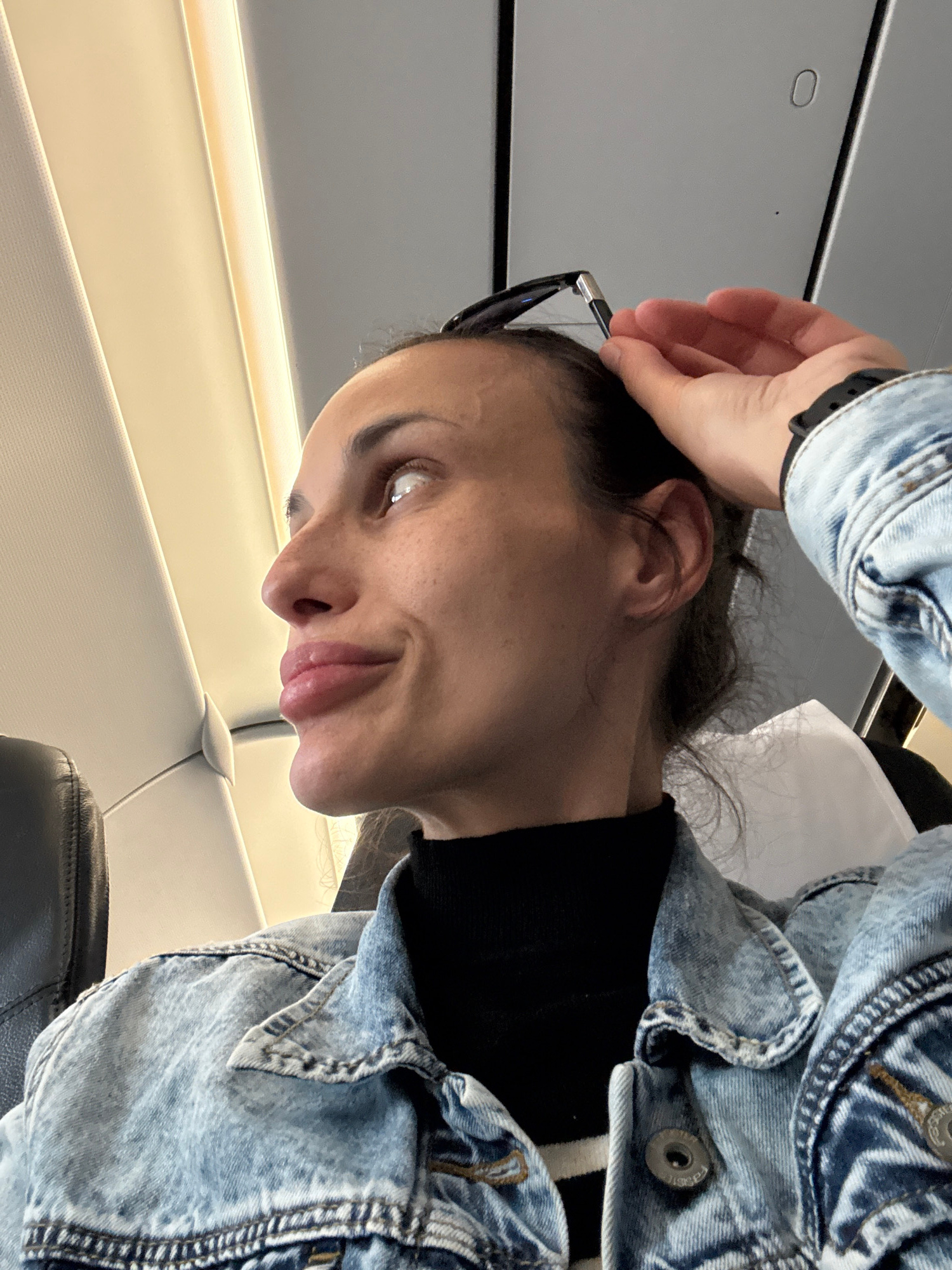 A person is seated, possibly on an airplane given the window frame and seat visible, in Spata-Loutsa Municipal Unit, Greece. They are wearing a denim jacket over a black top and have sunglasses perche…read more