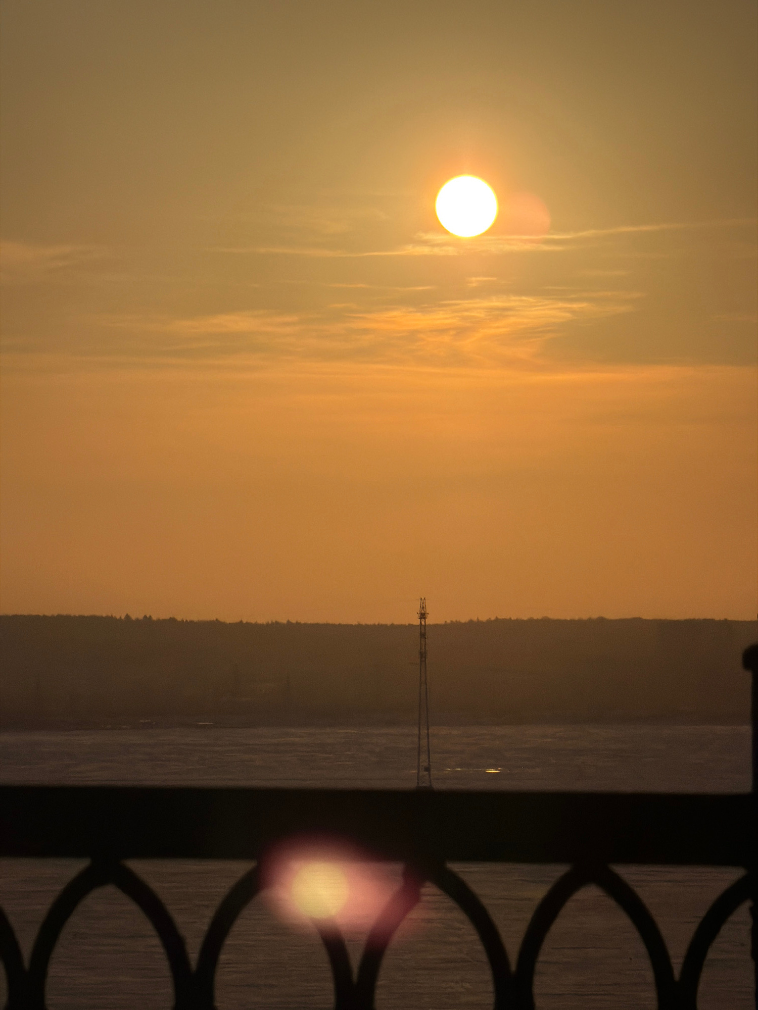 The image captures a sunset or sunrise over the Izhevsk Pond in Izhevsk, Russia. The sky, rendered in a gradient of orange and yellow tones, occupies the upper two-thirds of the frame. A brilliant, ci…read more