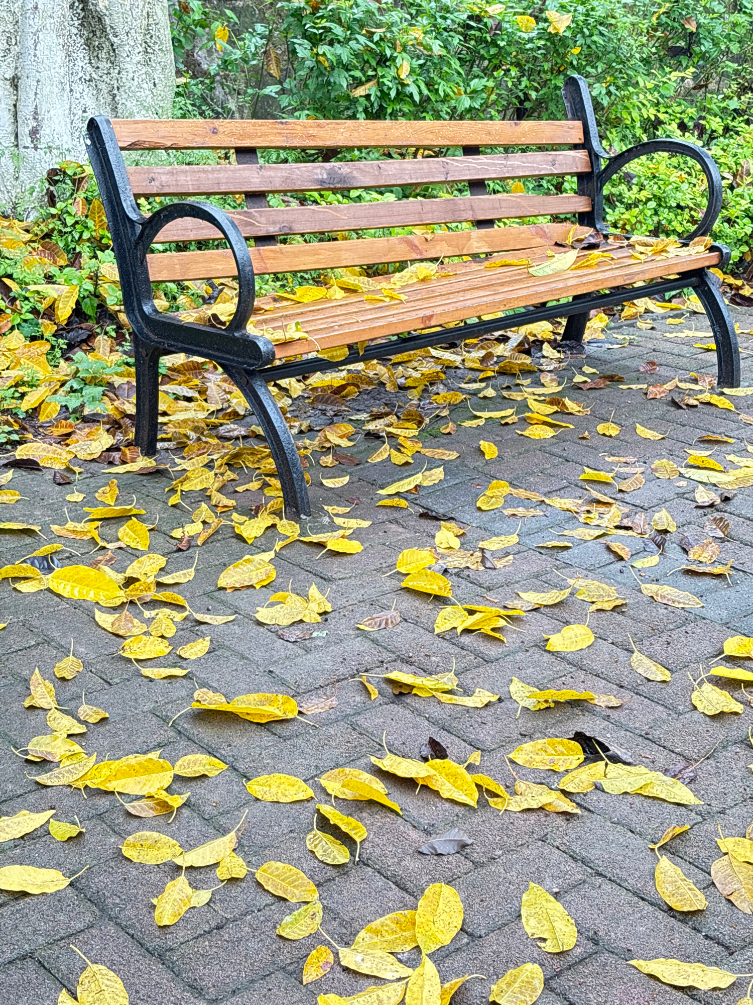 A photograph shows a park bench on a paved walkway covered in fallen yellow leaves. The bench has a black metal frame and wooden slats. The ground is paved with gray bricks. Green foliage is visible b…read more