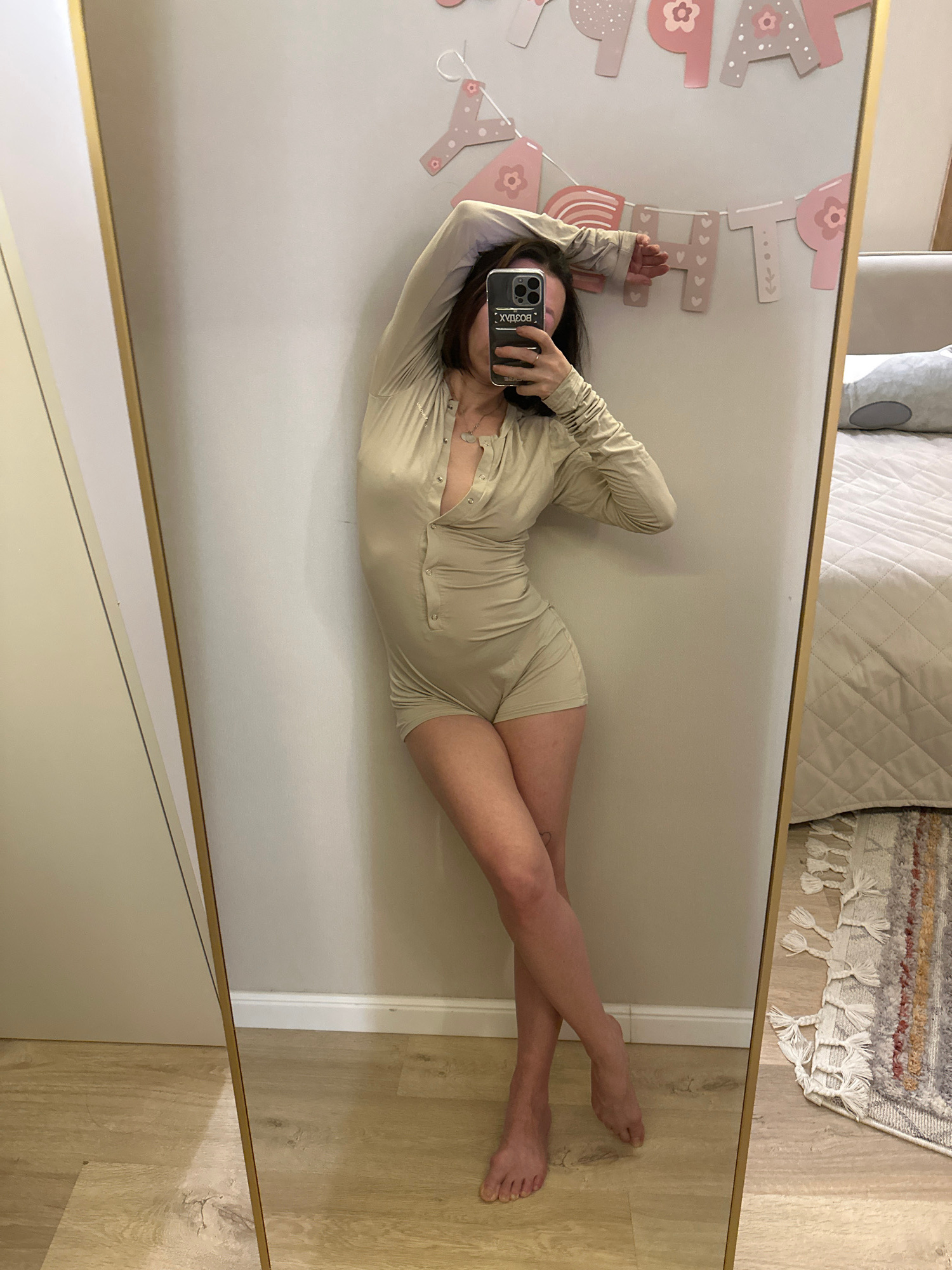 A woman is reflected in a mirror, positioned horizontally and wearing a light beige, long-sleeved romper with button detailing down the front. She is holding a mobile phone with a black case, obscurin…read more
