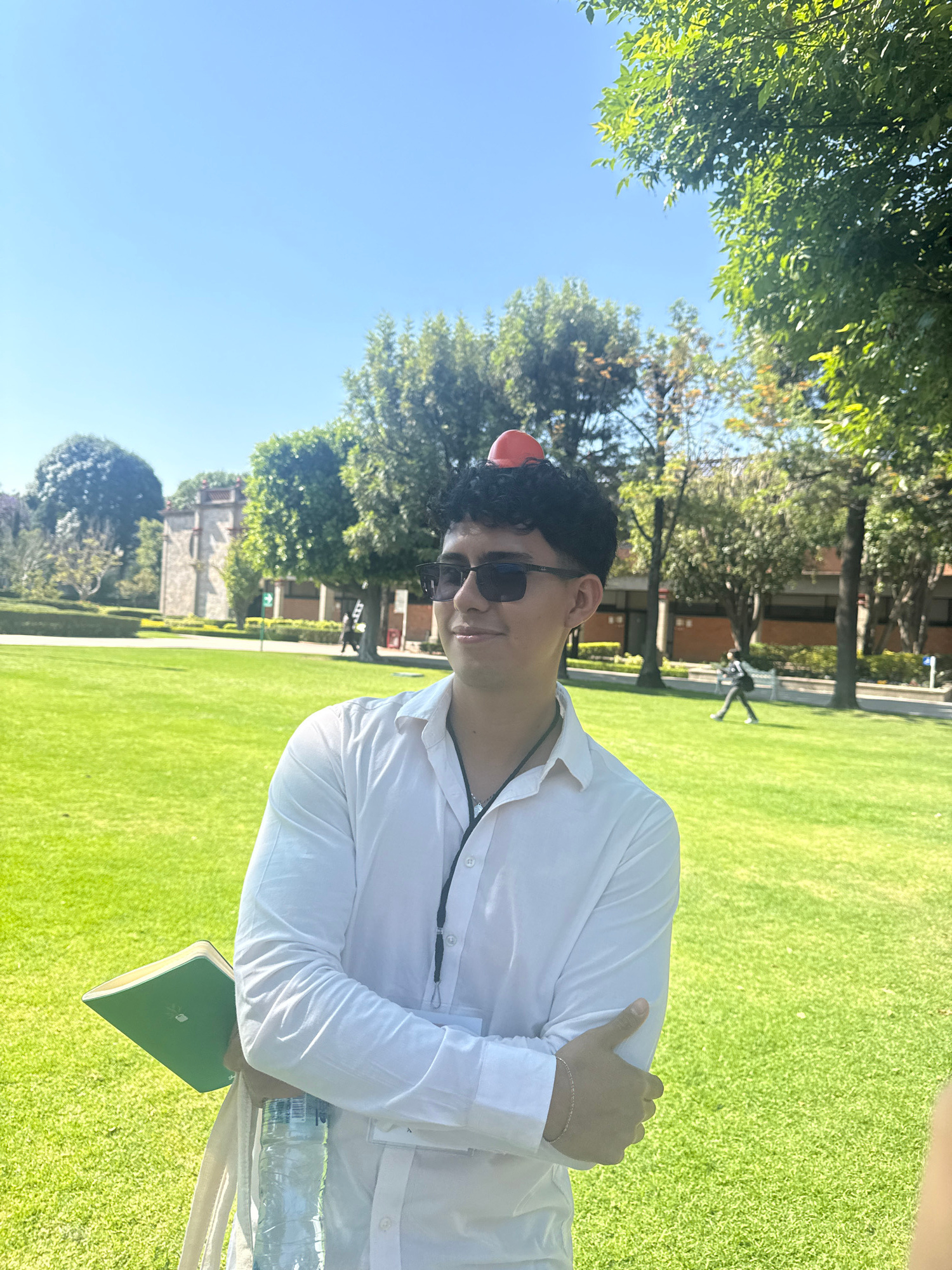 A young man stands on a lawn in San Andrés Cholula, Mexico. He wears a white shirt, sunglasses, and a red ball on his head. He is holding a green notebook and a water bottle. The background includes t…read more