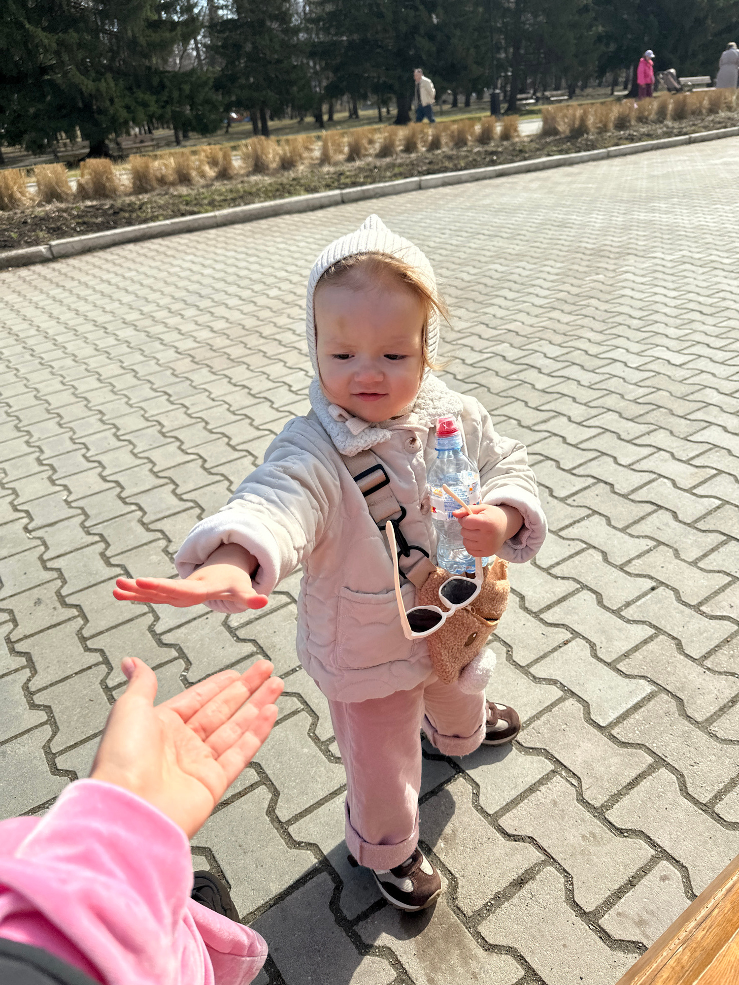 A baby wearing a white beanie, beige jacket, and pink pants, lying on a gray brick walkway. The baby holds a water bottle and a tan stuffed animal, and a pair of sunglasses is lying on the baby. A hanβ¦read more