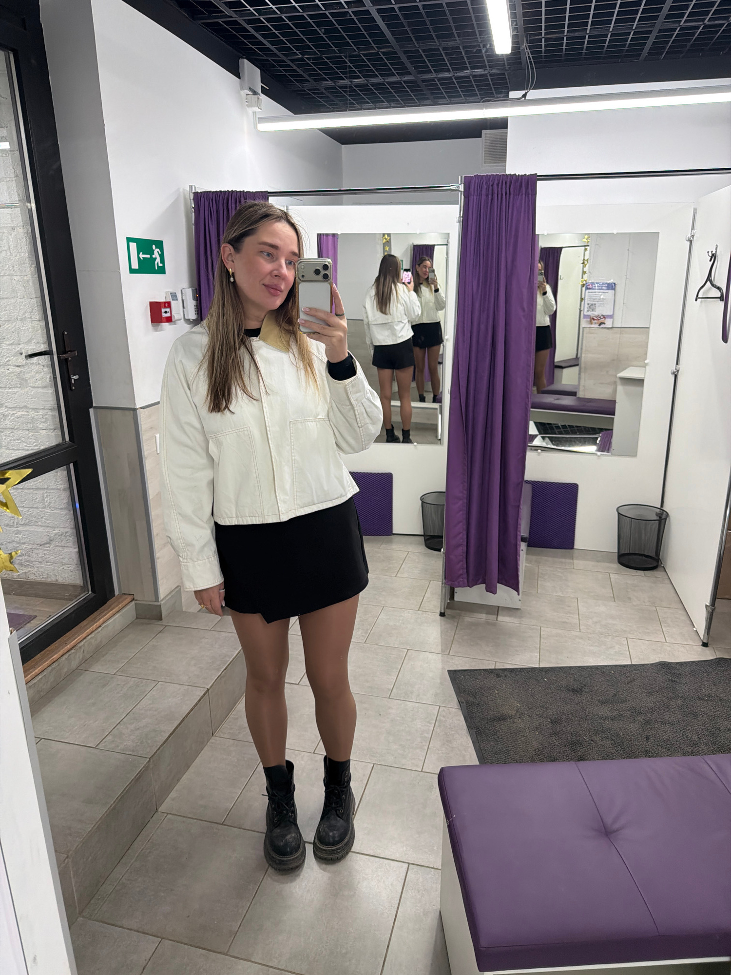 A young woman in a white jacket and black skirt is taking a selfie in a fitting room with purple curtains and seating. She is wearing black boots. The fitting room is in Moscow, Russia. The room has a…read more